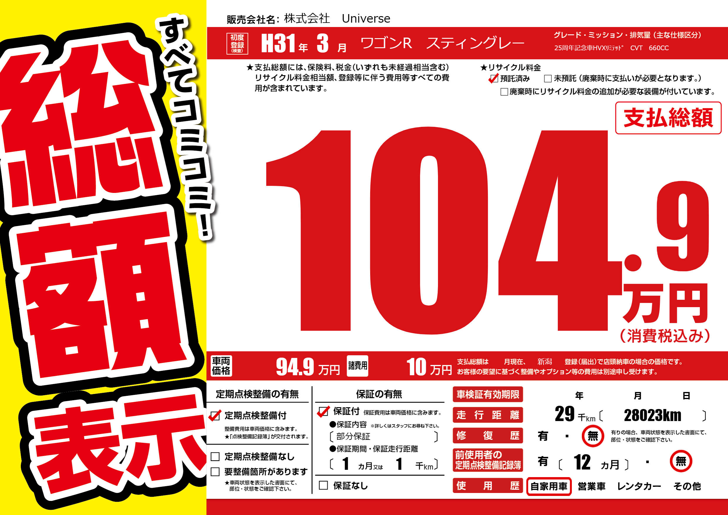 | 車名 | ワゴンR スティングレー | グレード ミッション 排気量 |