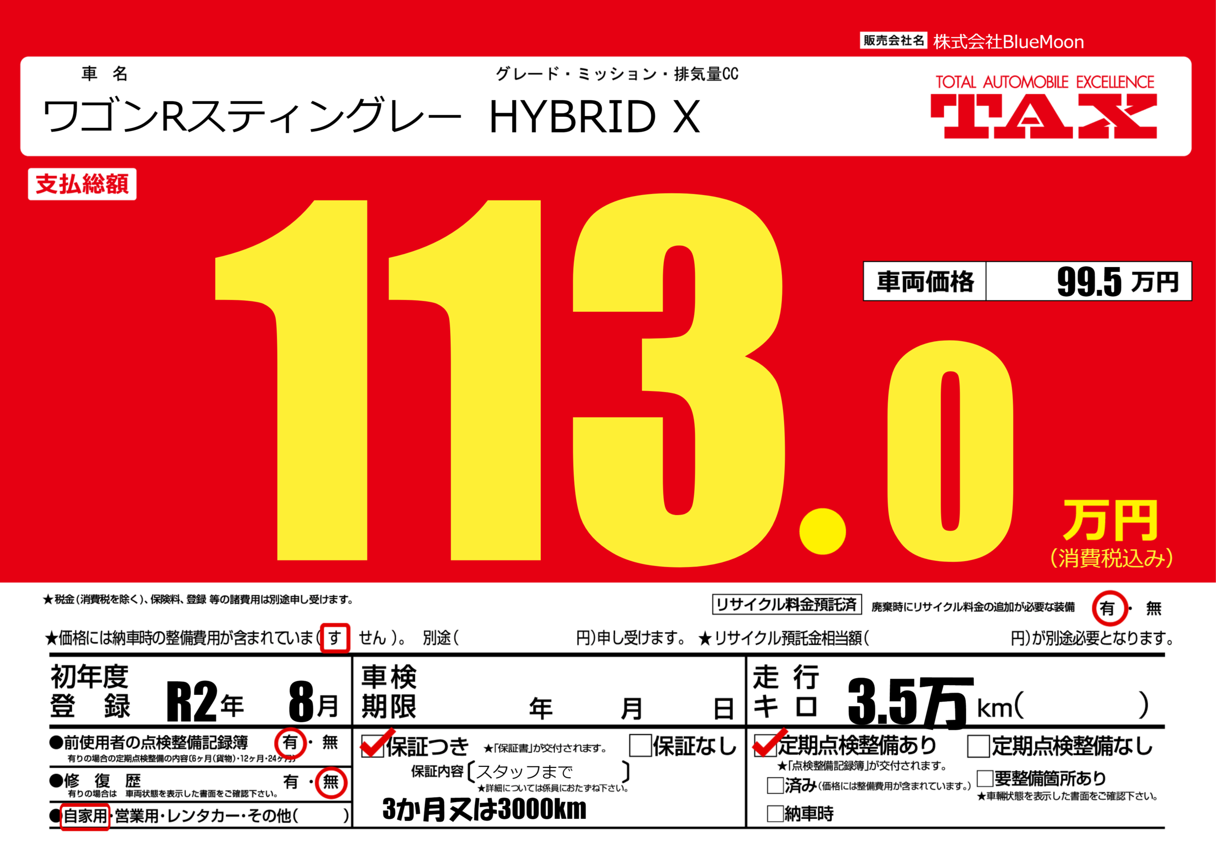 保証付き 保証内容(スタッフまで) ---ヶ月または()千kmまで |