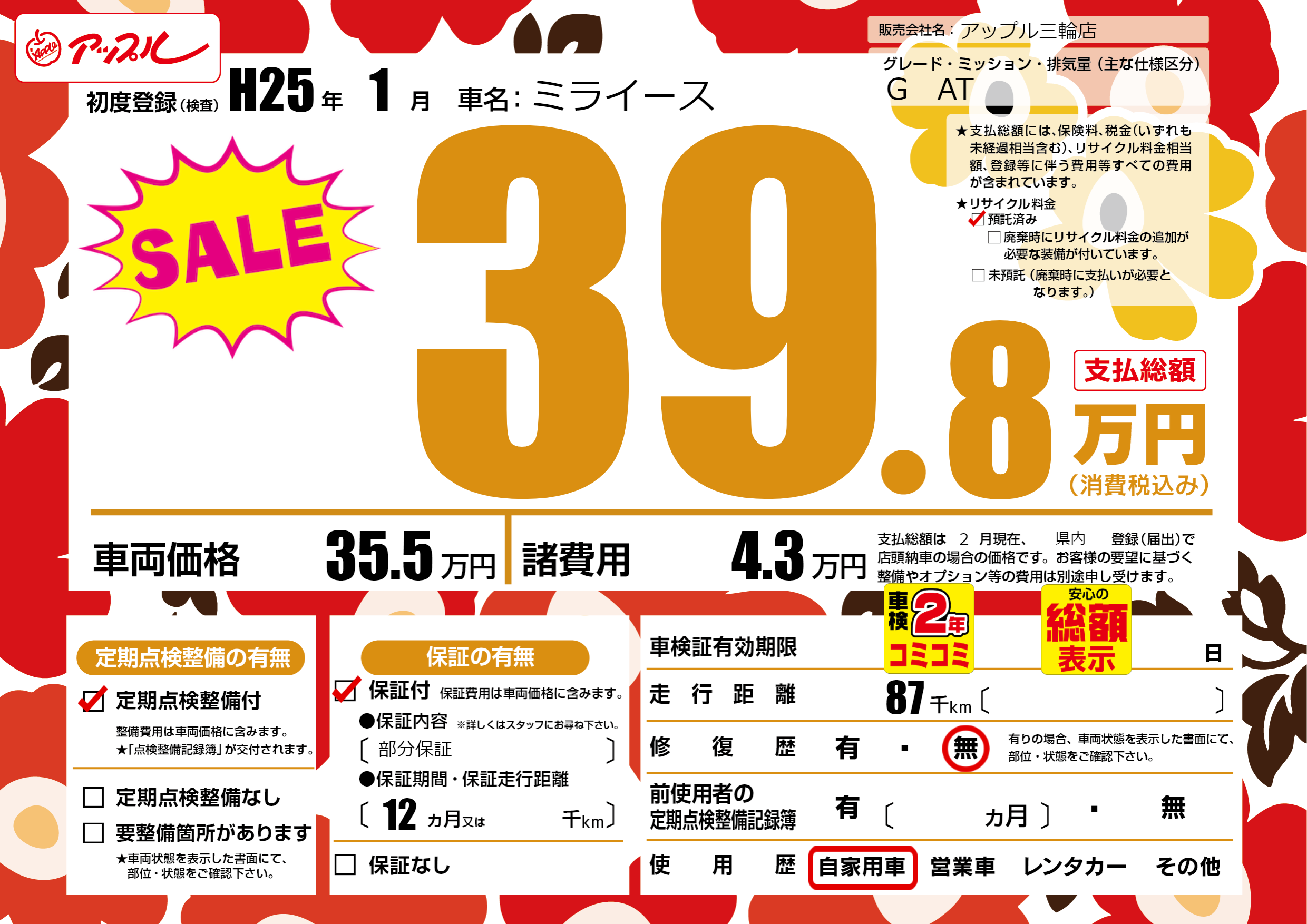 保証付き 保証内容(部分保証) 12ヶ月または()千kmまで |