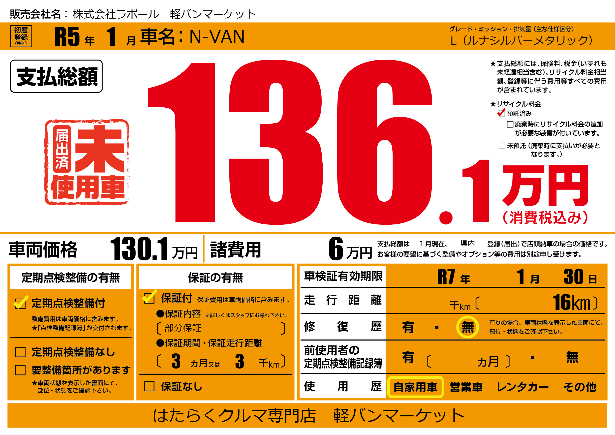 | 車名 | N-VAN | グレード ミッション 排気量 |