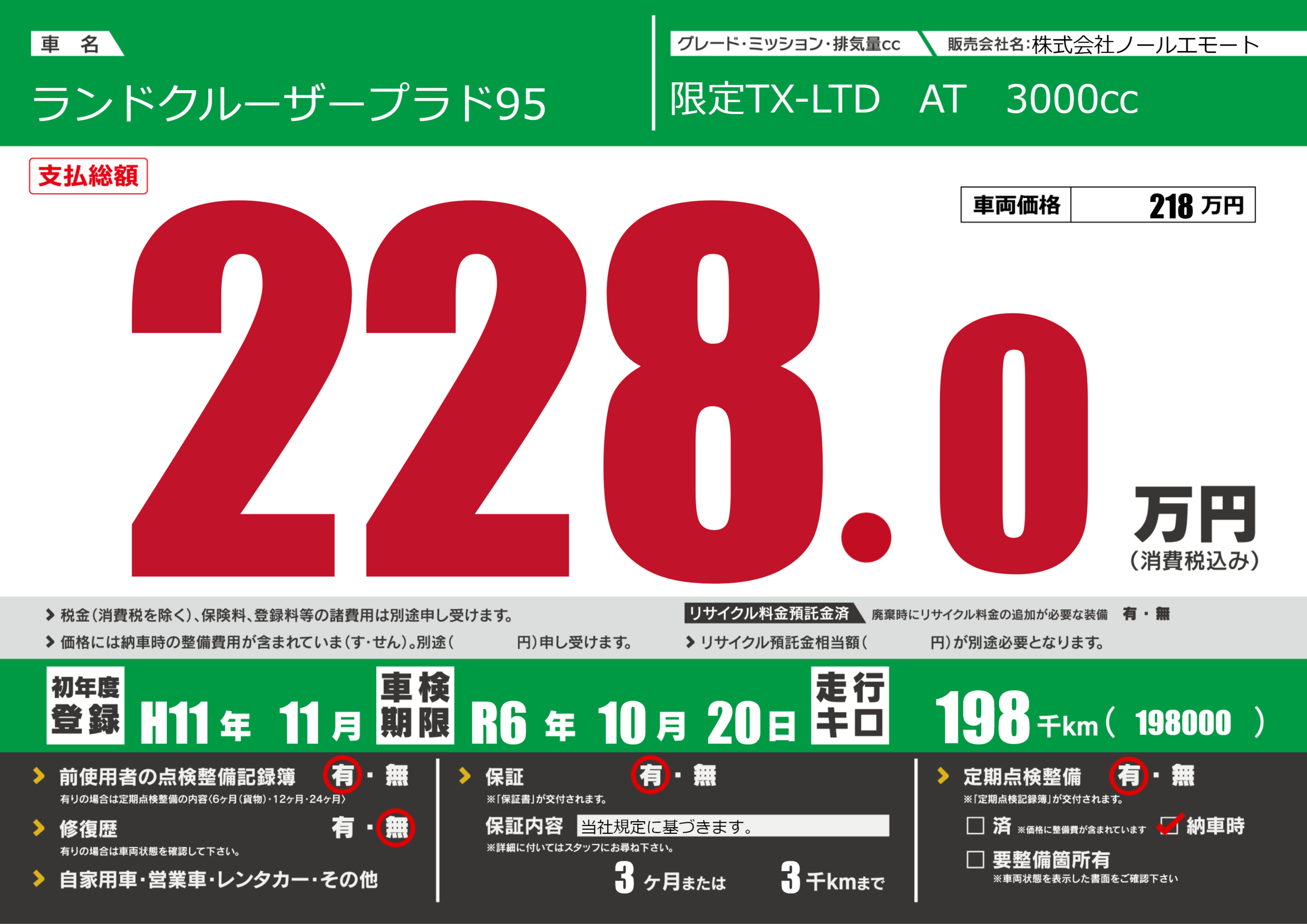 | 定期点検整備 | 定期点検整備あり 納車時あり | ||