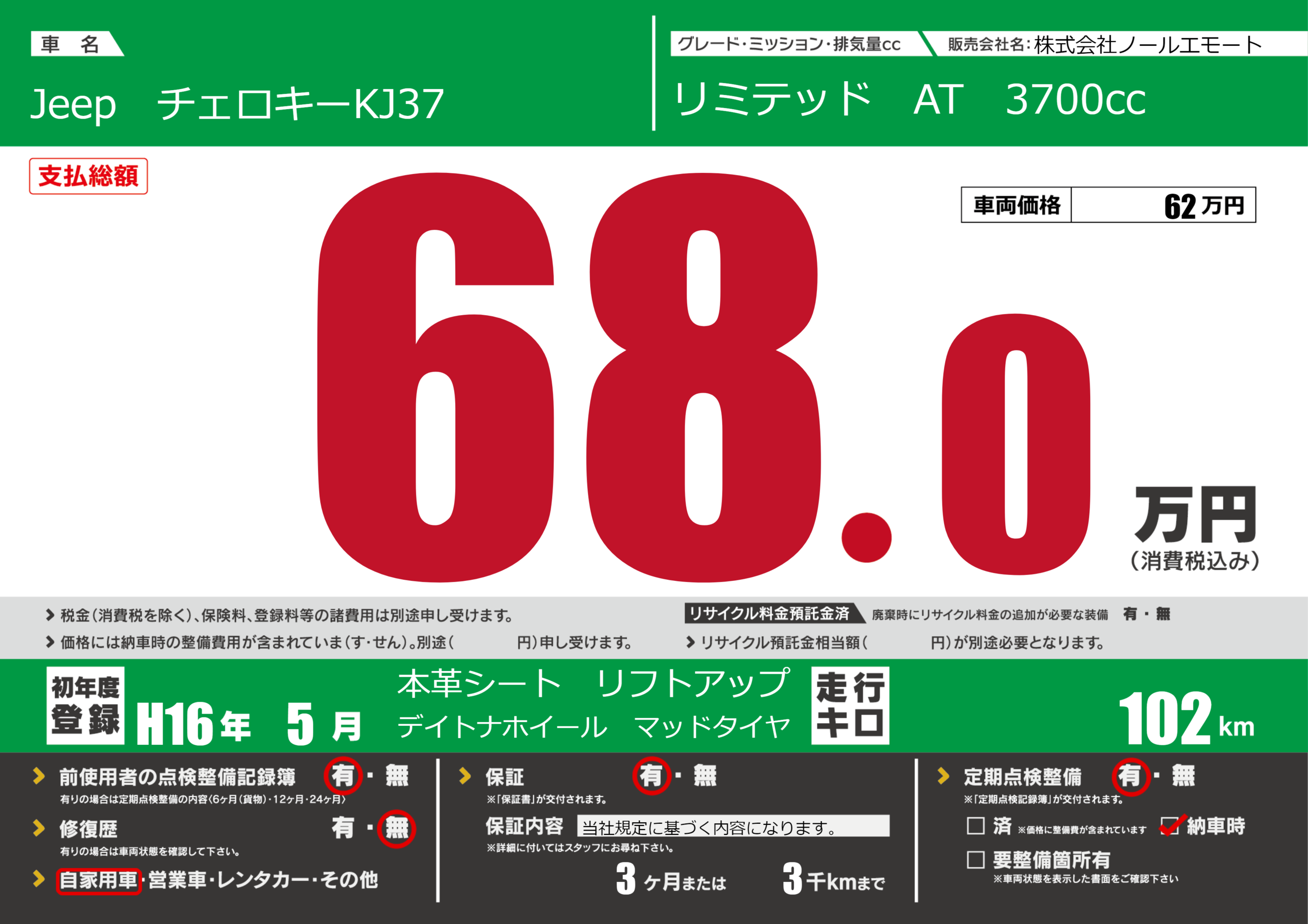 | 車名 | Jeep チェロキーKJ37 | グレード ミッション 排気量 |