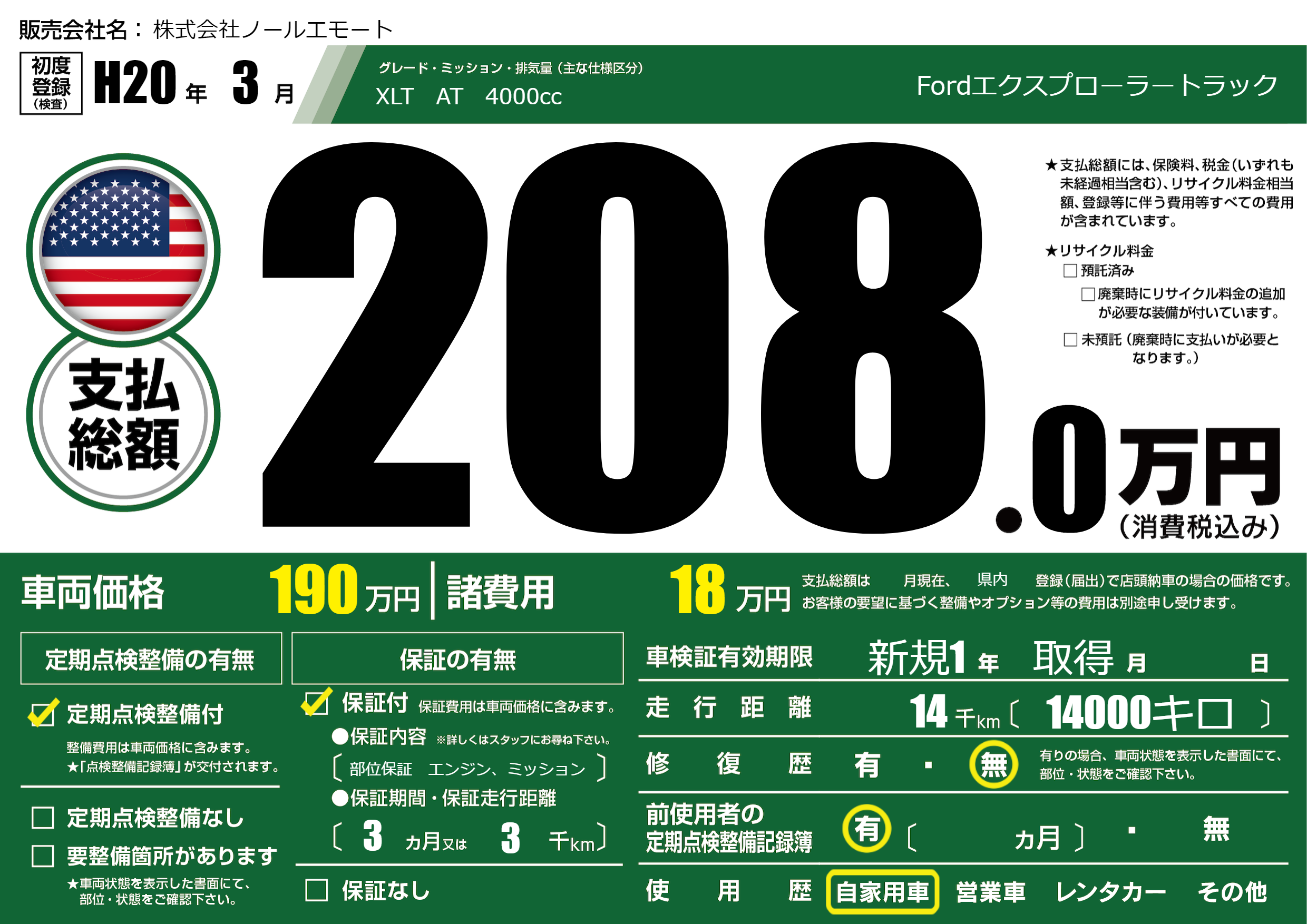 | 車名 | Fordエクスプローラートラック | グレード ミッション 排気量 |