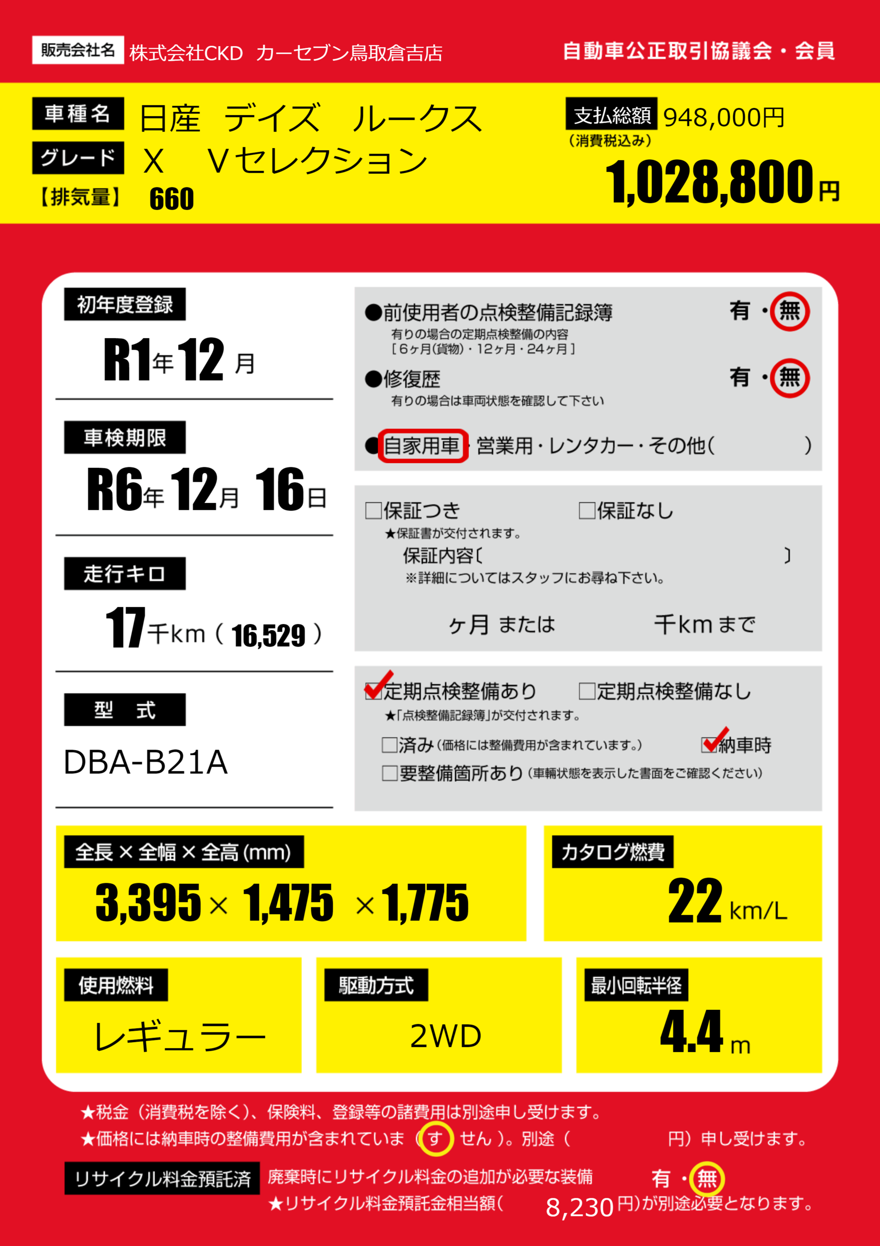 | 車名 | 日産 デイズ ルークス | グレード ミッション 排気量 |