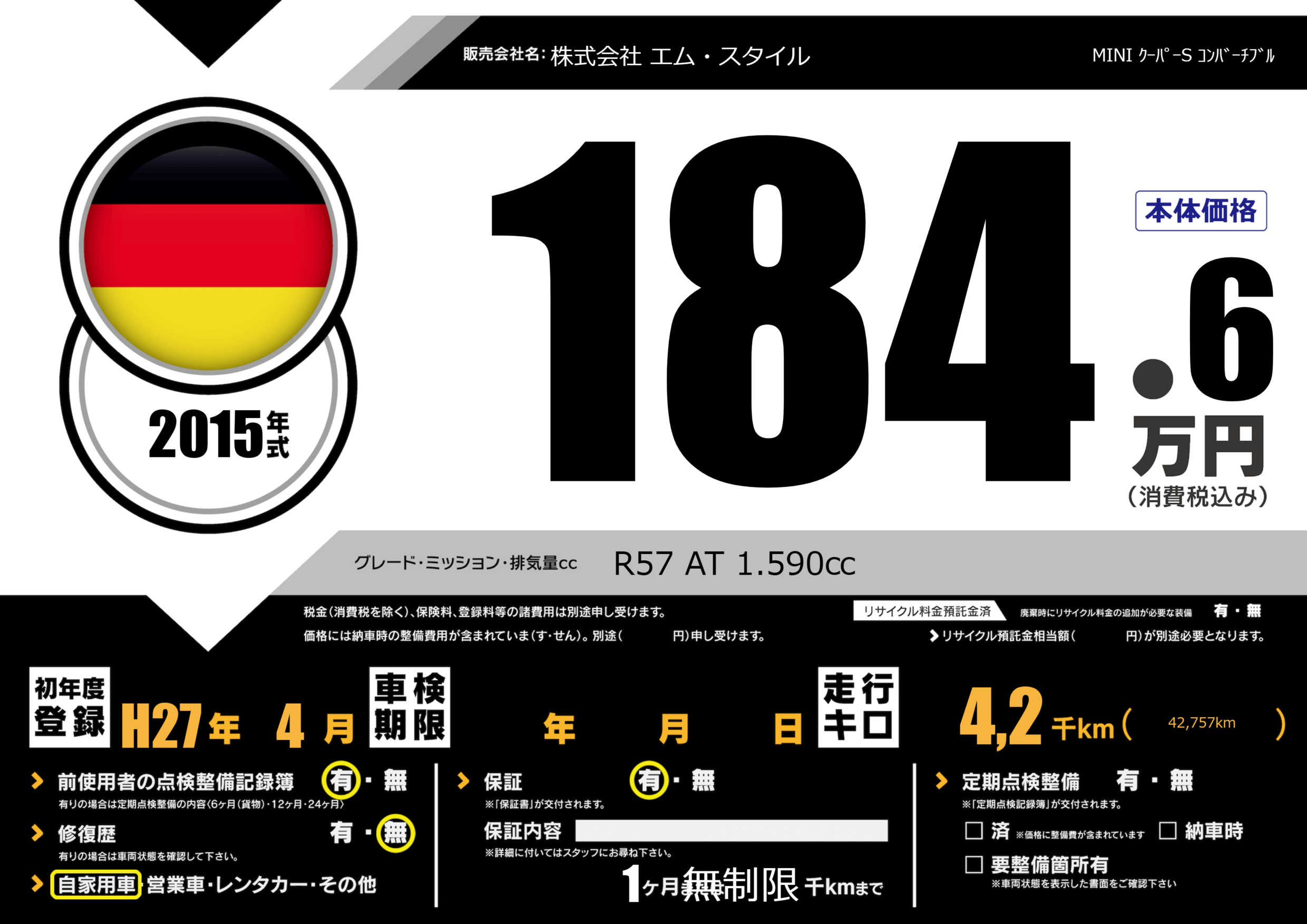 | 車名 | MINI クーパーS コンバーチブル | グレード ミッション 排気量 |
