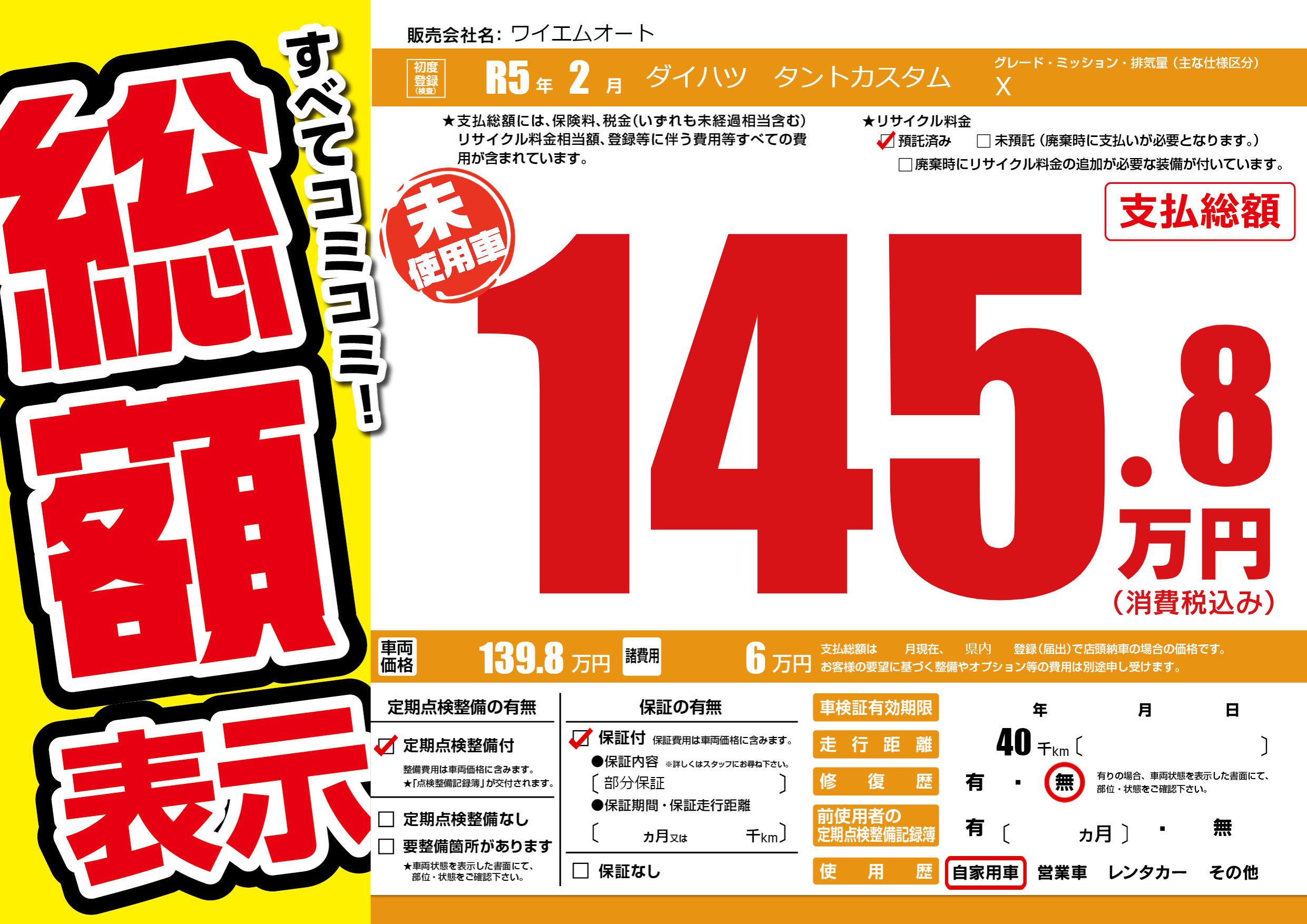 | 走行キロ | 4万km | 初年度登録 | R5年2月 |