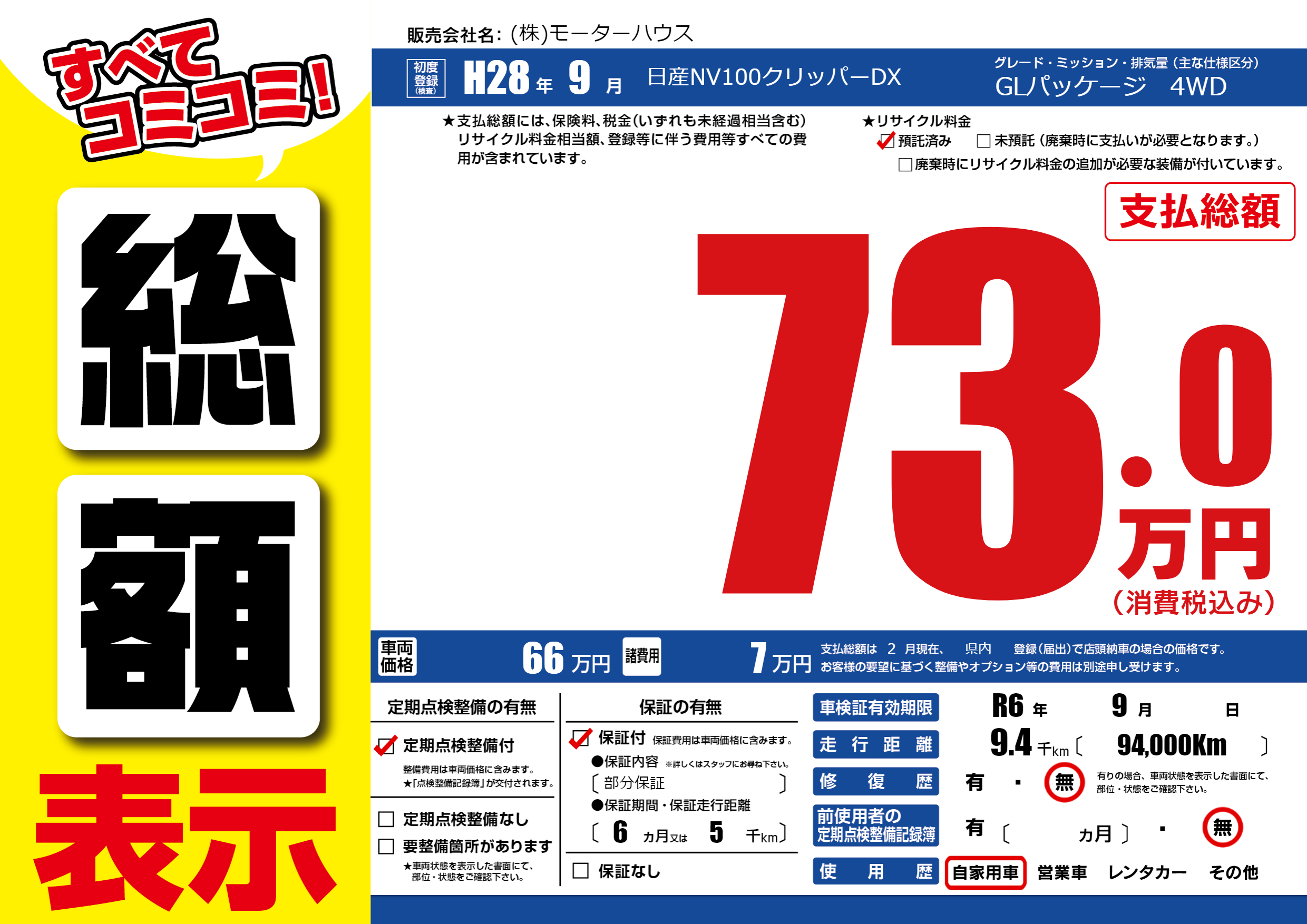 | 車名 | 日産NV100クリッパーDX | グレード ミッション 排気量 |