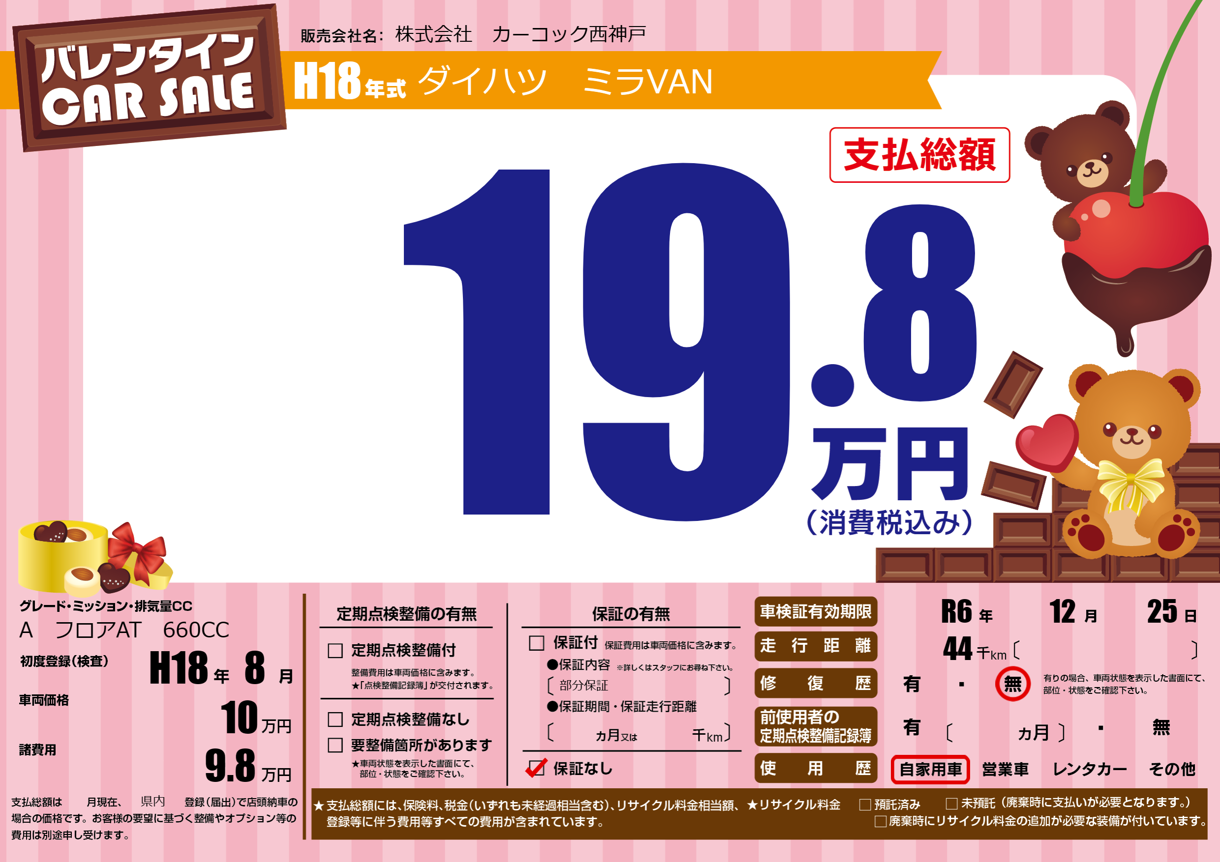 | 走行キロ | 4.4万km | 初年度登録 | H18年8月 |