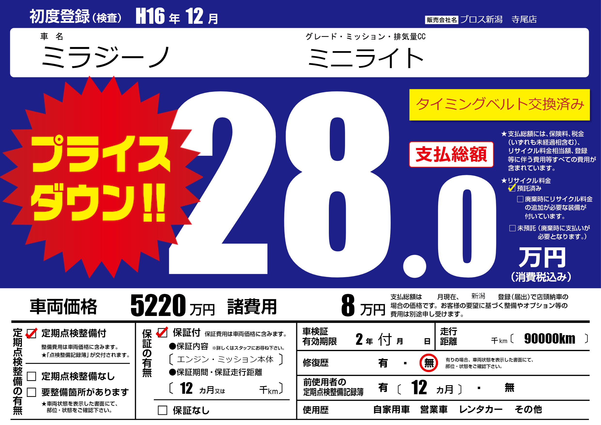 | 車名 | ミラジーノ | グレード ミッション 排気量 |