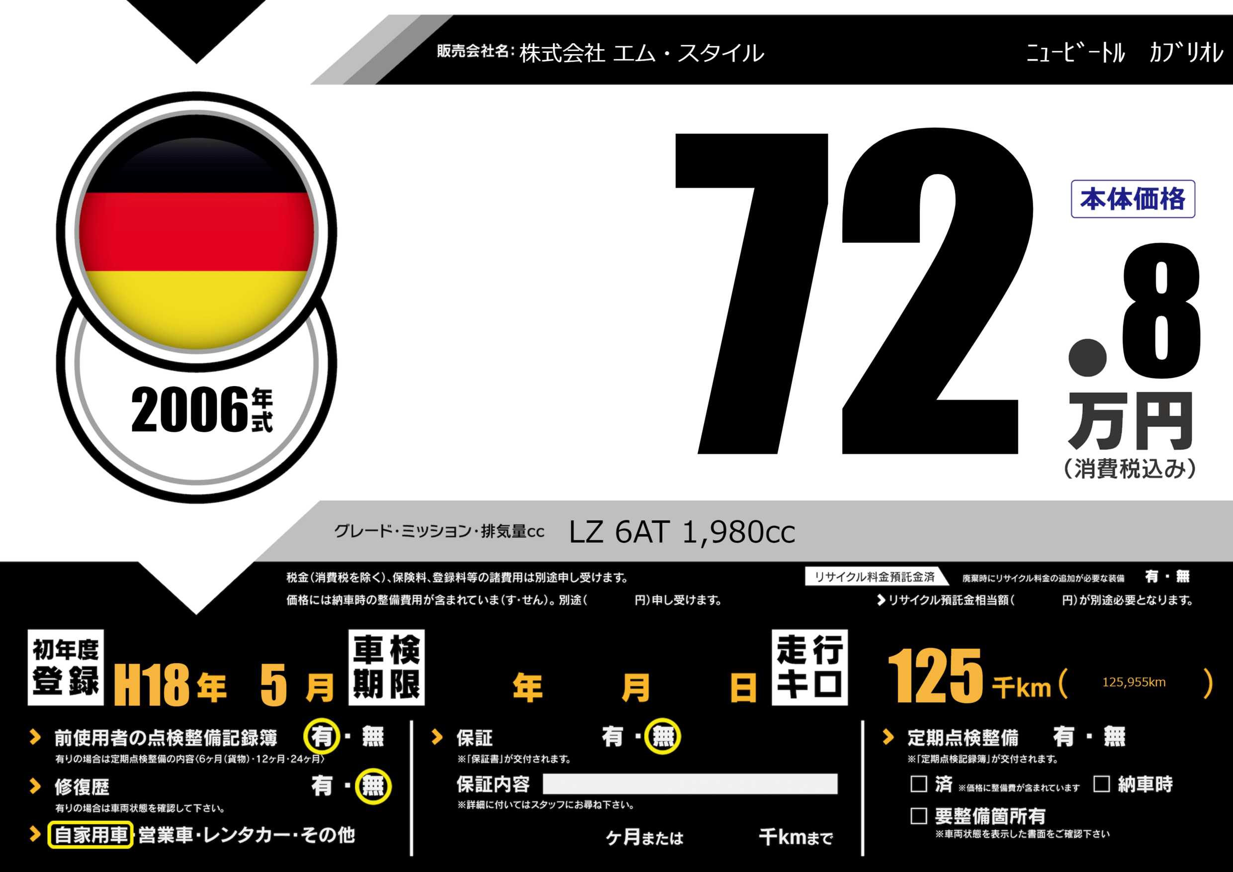 | 走行キロ | 12.5万km | 初年度登録 | H18年5月 |