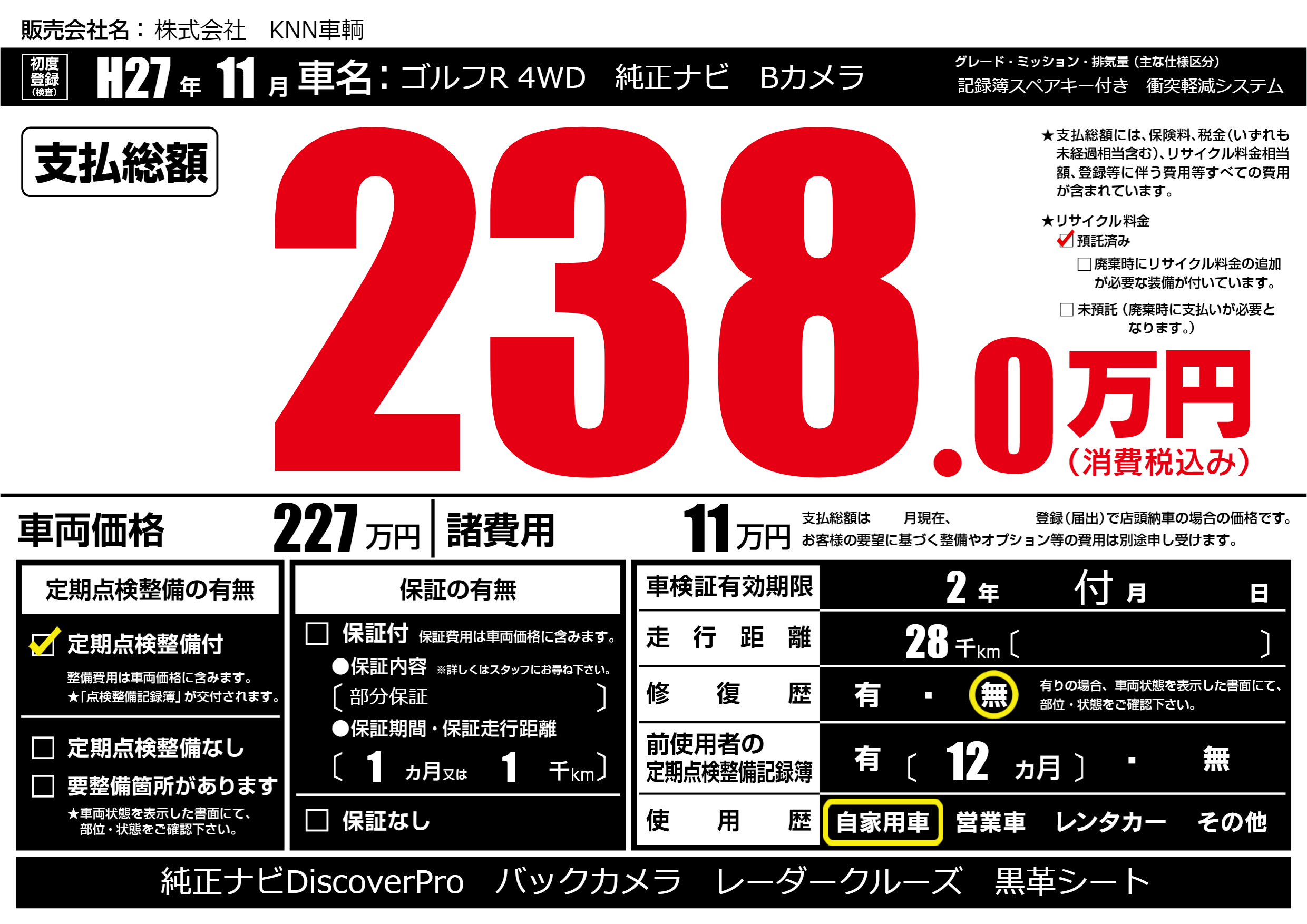 | 走行キロ | 2.8万km | 初年度登録 | H27年11月 |
