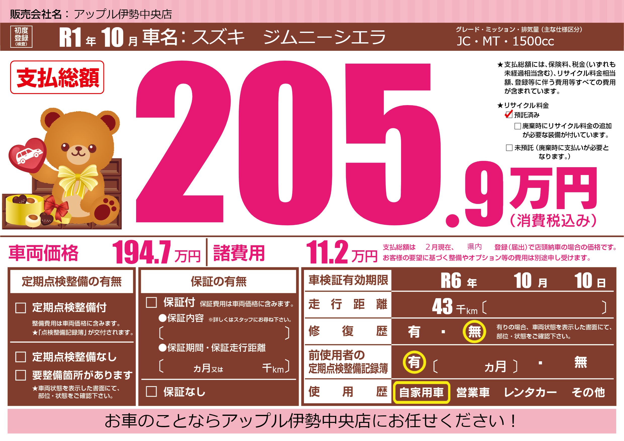 | 車検制限 | R6年 10月 10日 | ||
