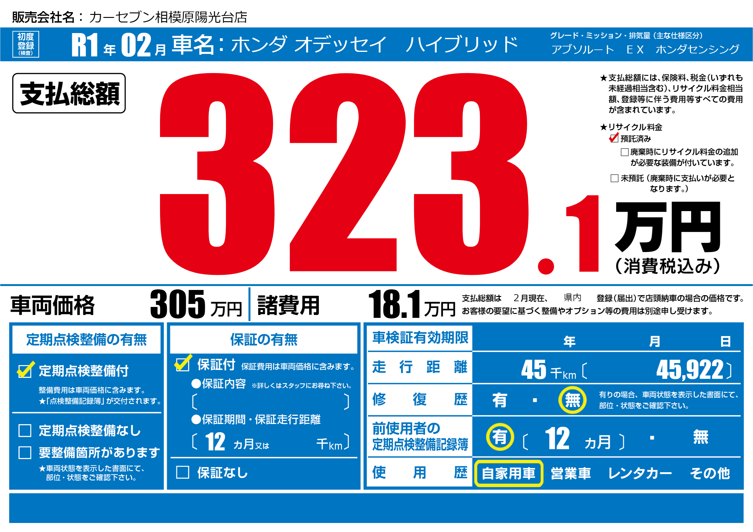 | 車名 | ホンダ オデッセイ ハイブリッド | グレード ミッション 排気量 |