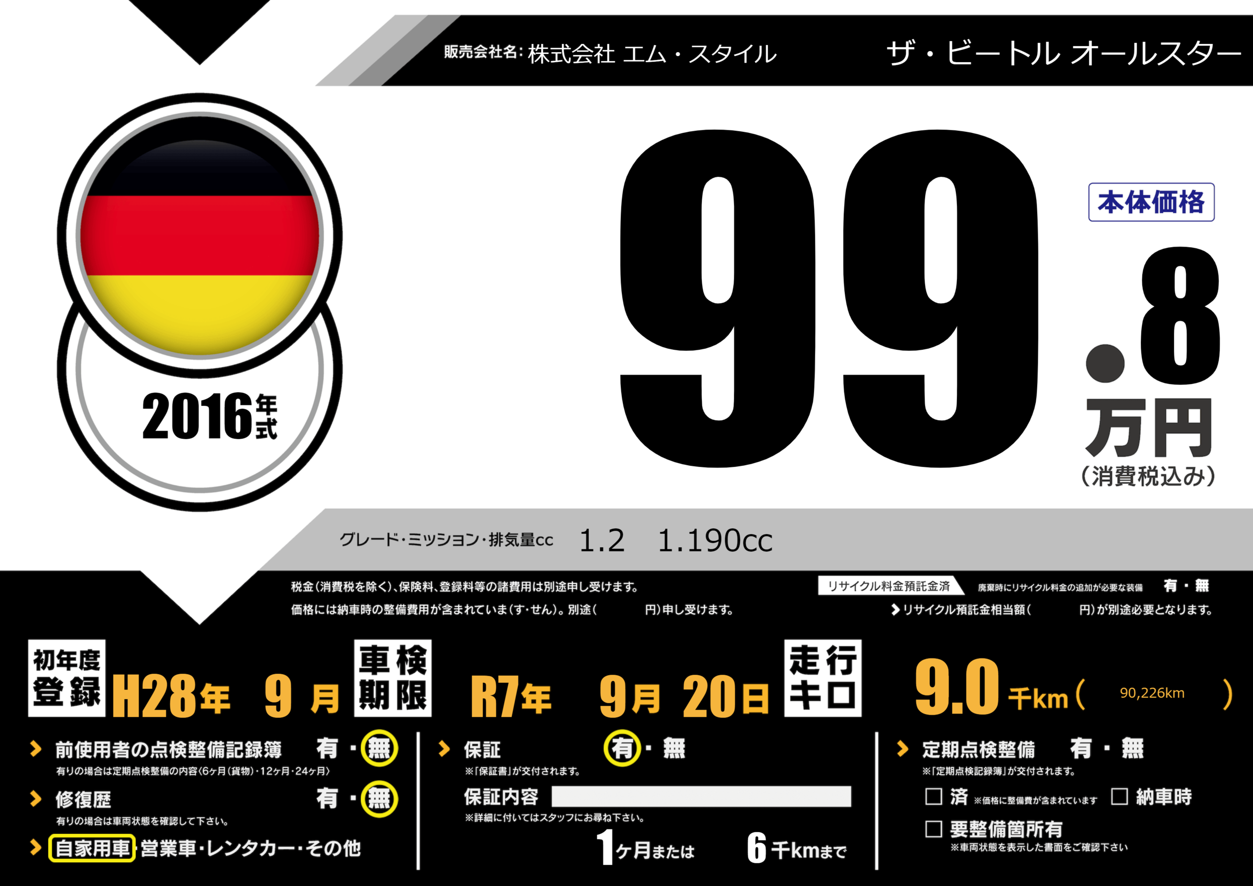 | 車名 | ザ・ビートル オールスター | グレード ミッション 排気量 |