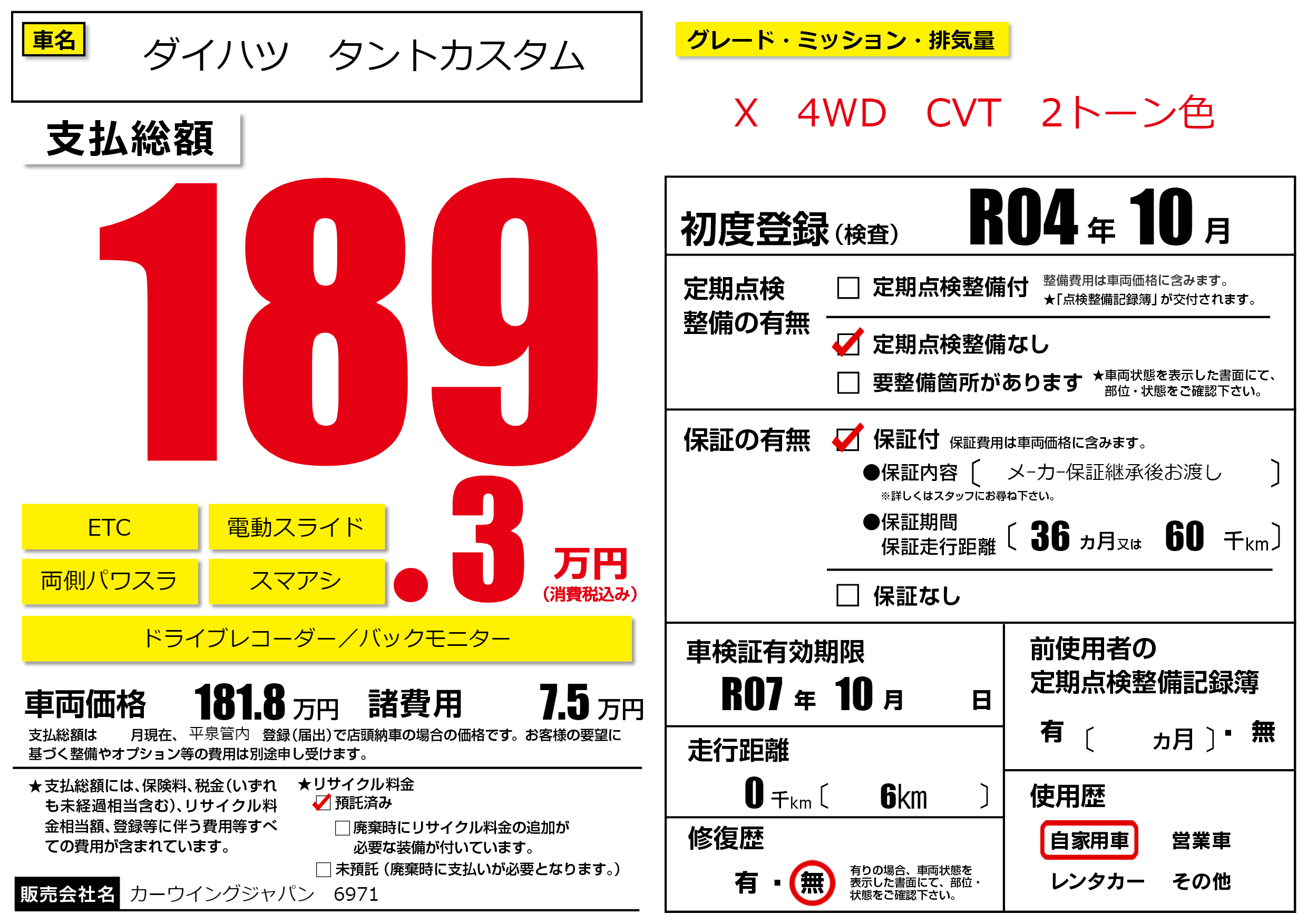 | 車名 | ダイハツ タントカスタム | グレード ミッション 排気量 |