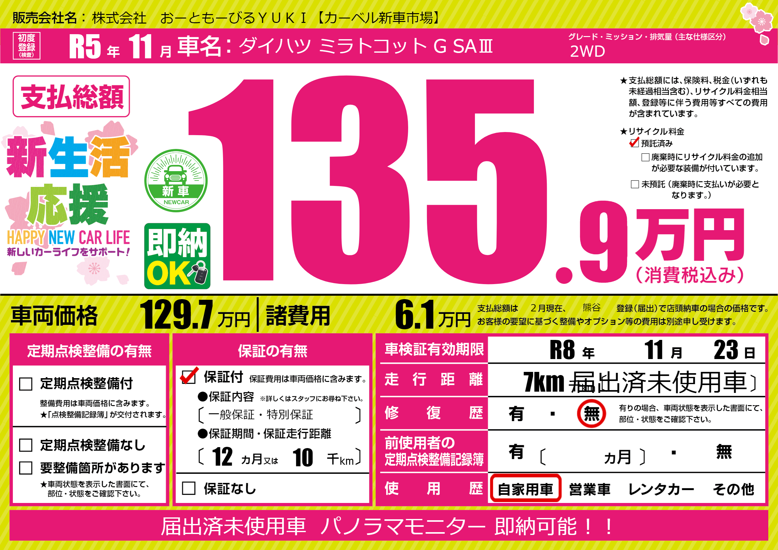 | 走行キロ | 0.7万km | 初年度登録 | R5年11月 |
