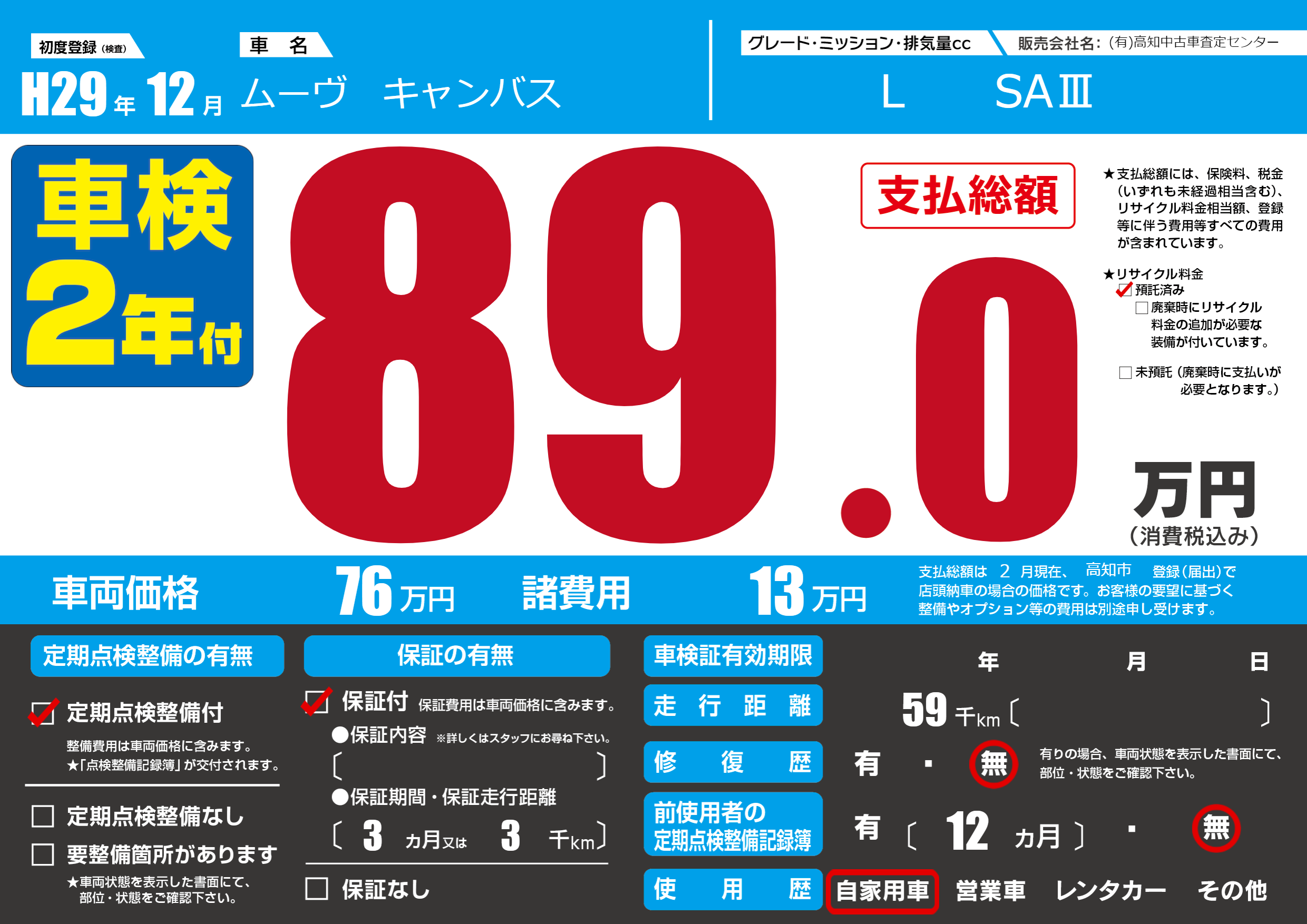| 車名 | ムーヴ キャンバス | グレード ミッション 排気量 |