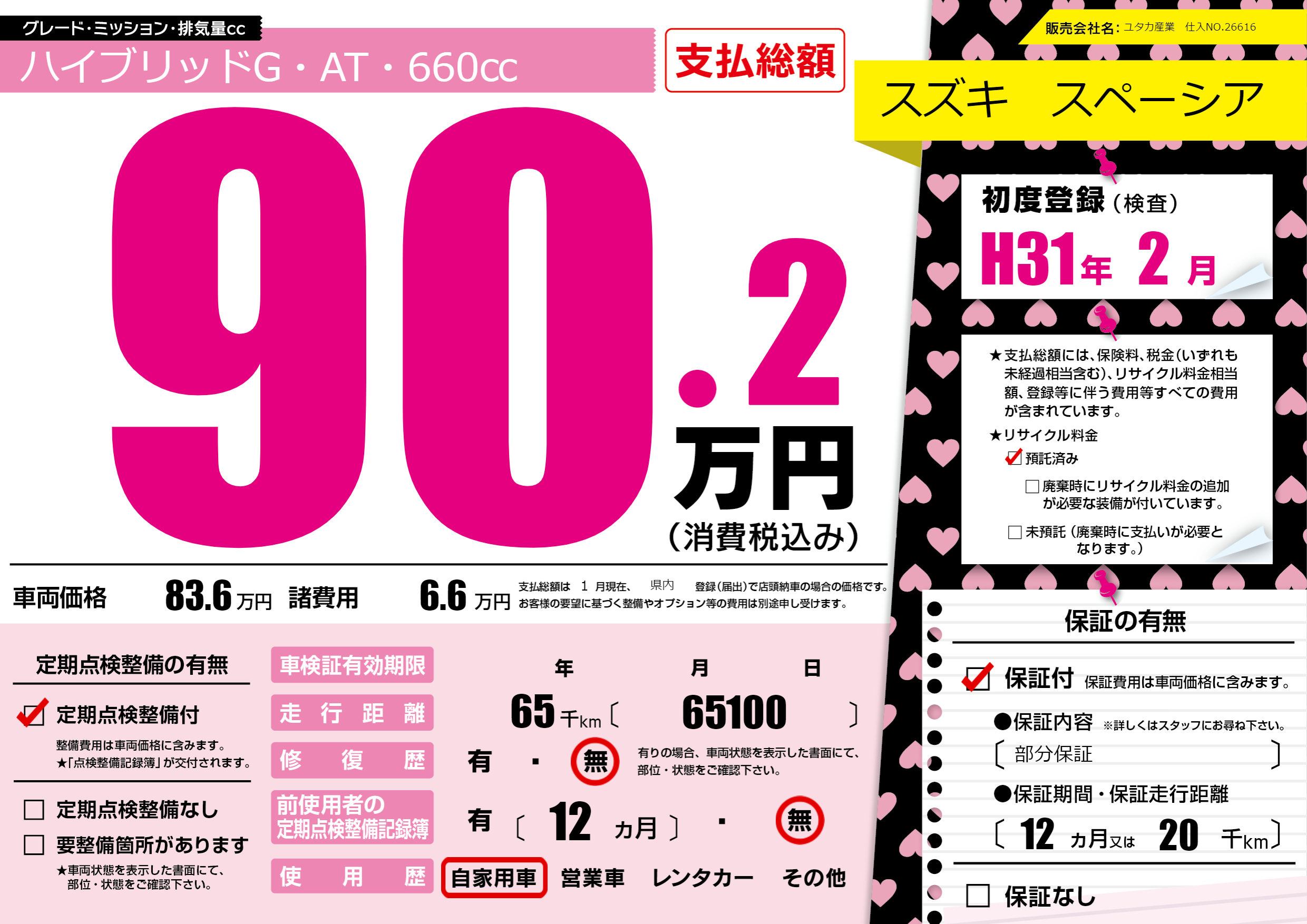 | 車名 | スズキ スペーシア | グレード ミッション 排気量 |
