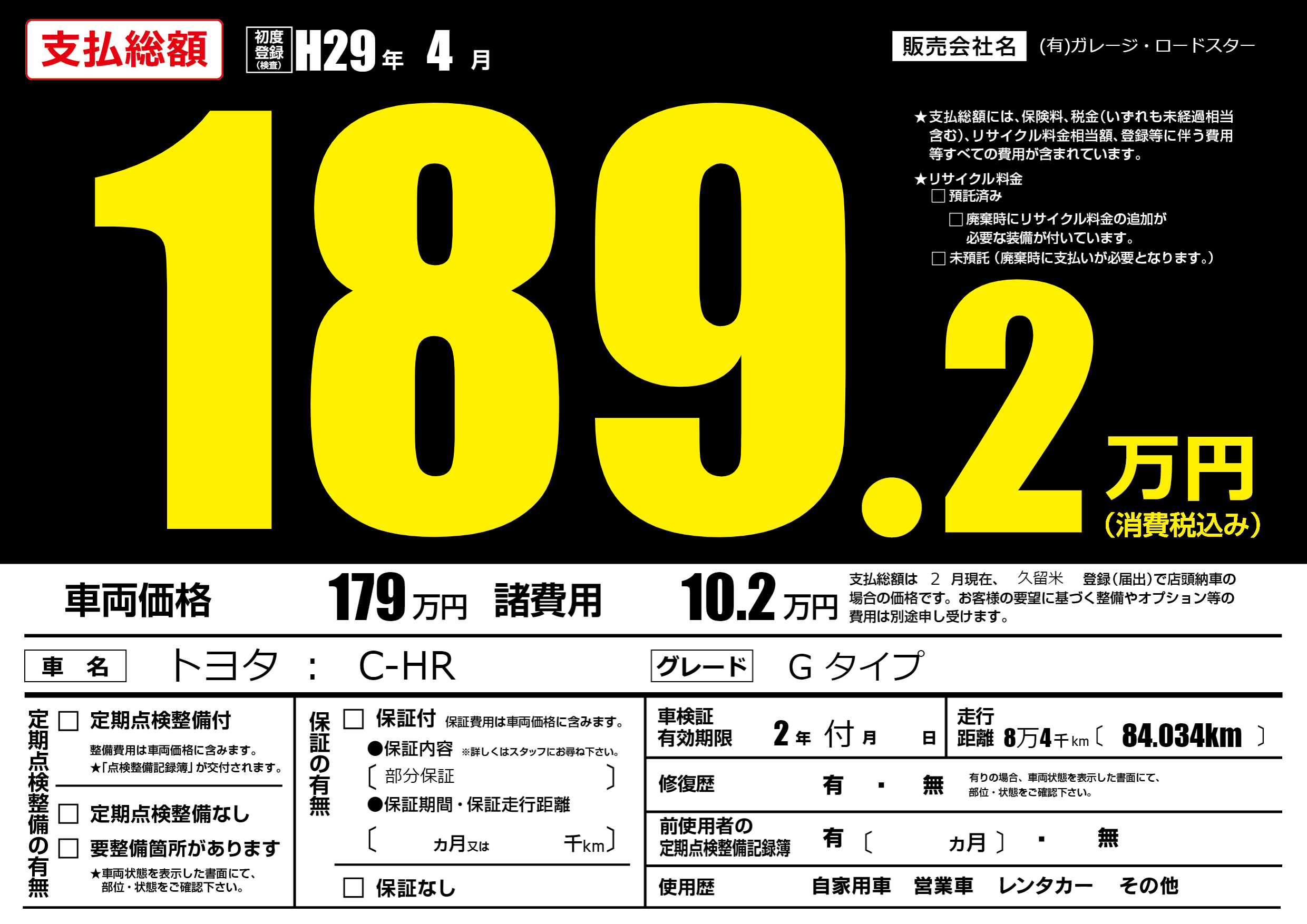 | 車名 | トヨタ : C-HR | グレード ミッション 排気量 |