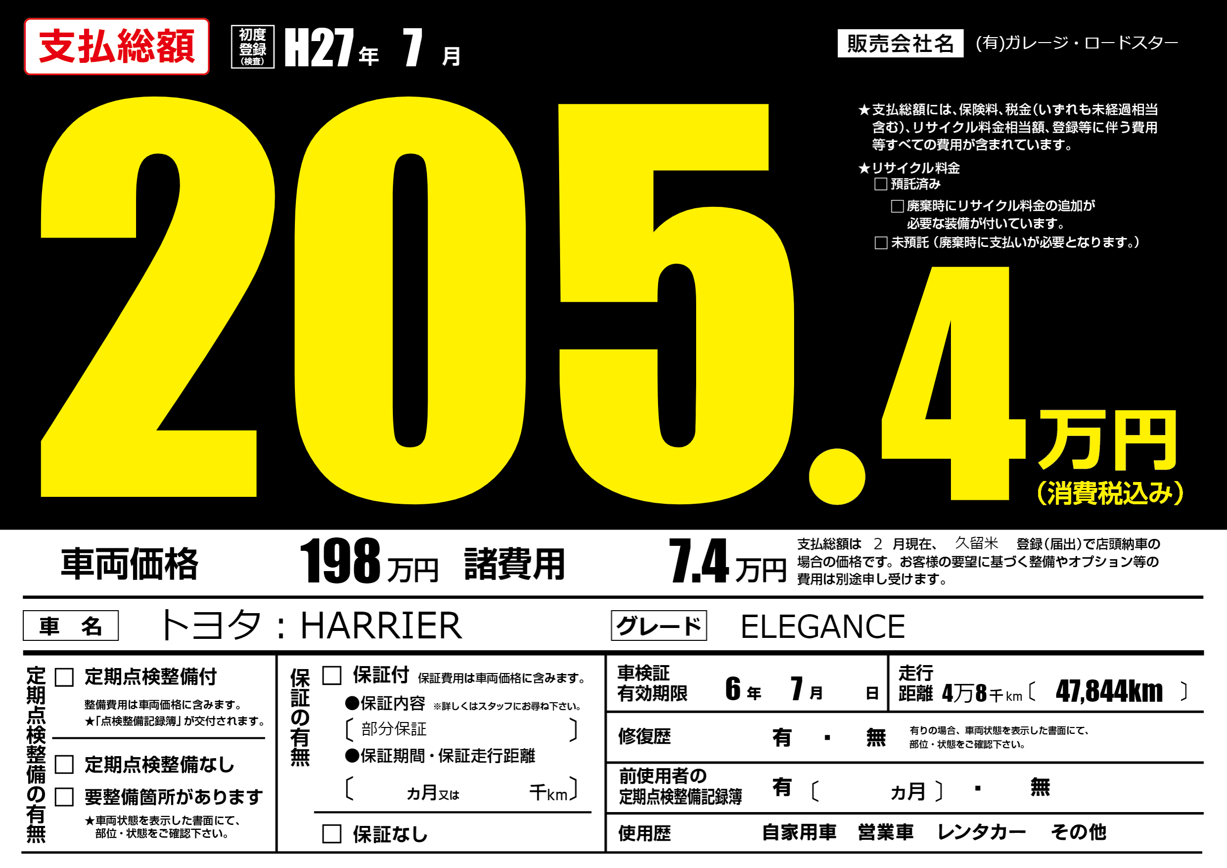 | 車名 | トヨタ:HARRIER | グレード ミッション 排気量 |