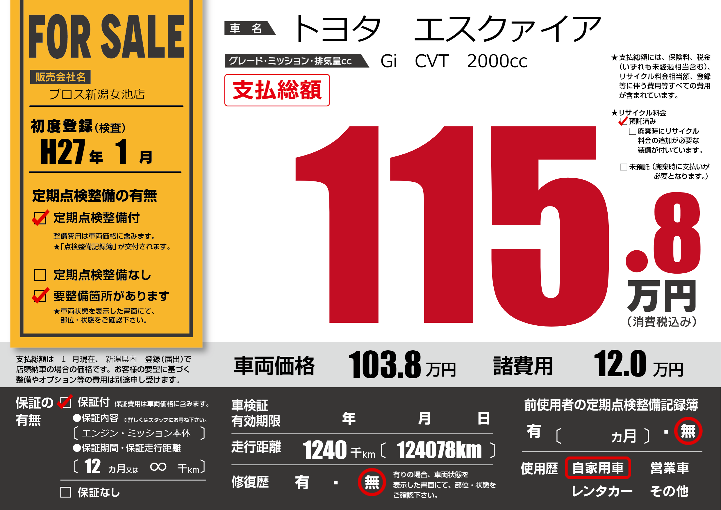 | 走行キロ | 124万km | 初年度登録 | H27年1月 |