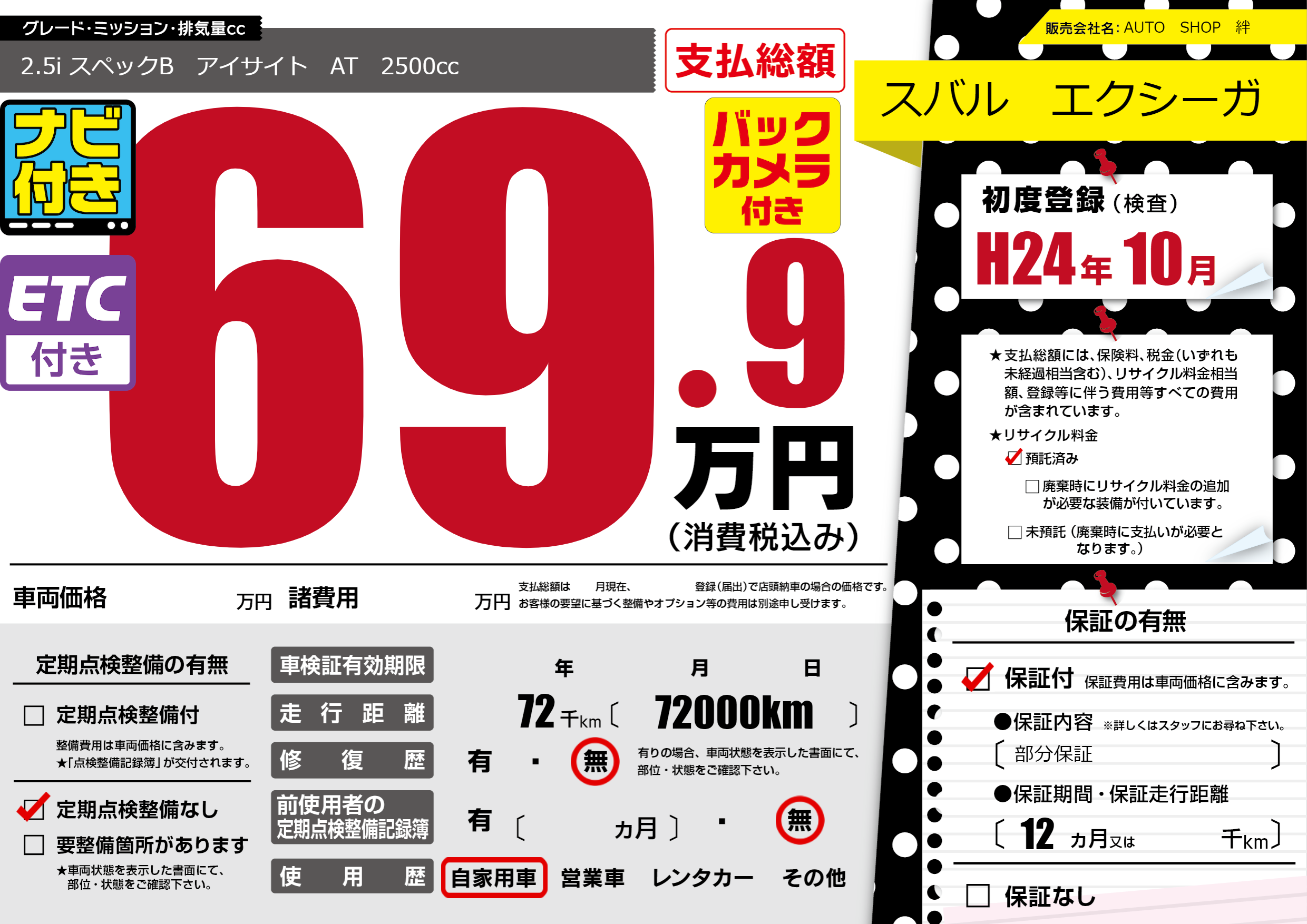 | 走行キロ | 7.2万km | 初年度登録 | H24年10月 |