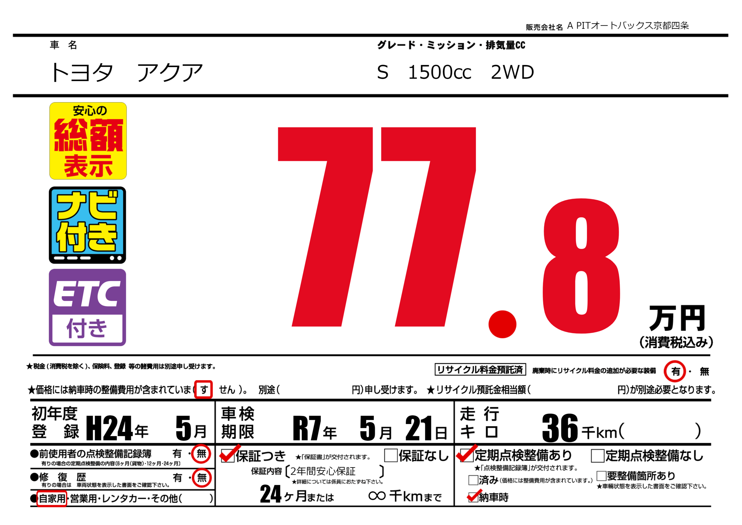 | 車名 | トヨタ アクア | グレード ミッション 排気量 |