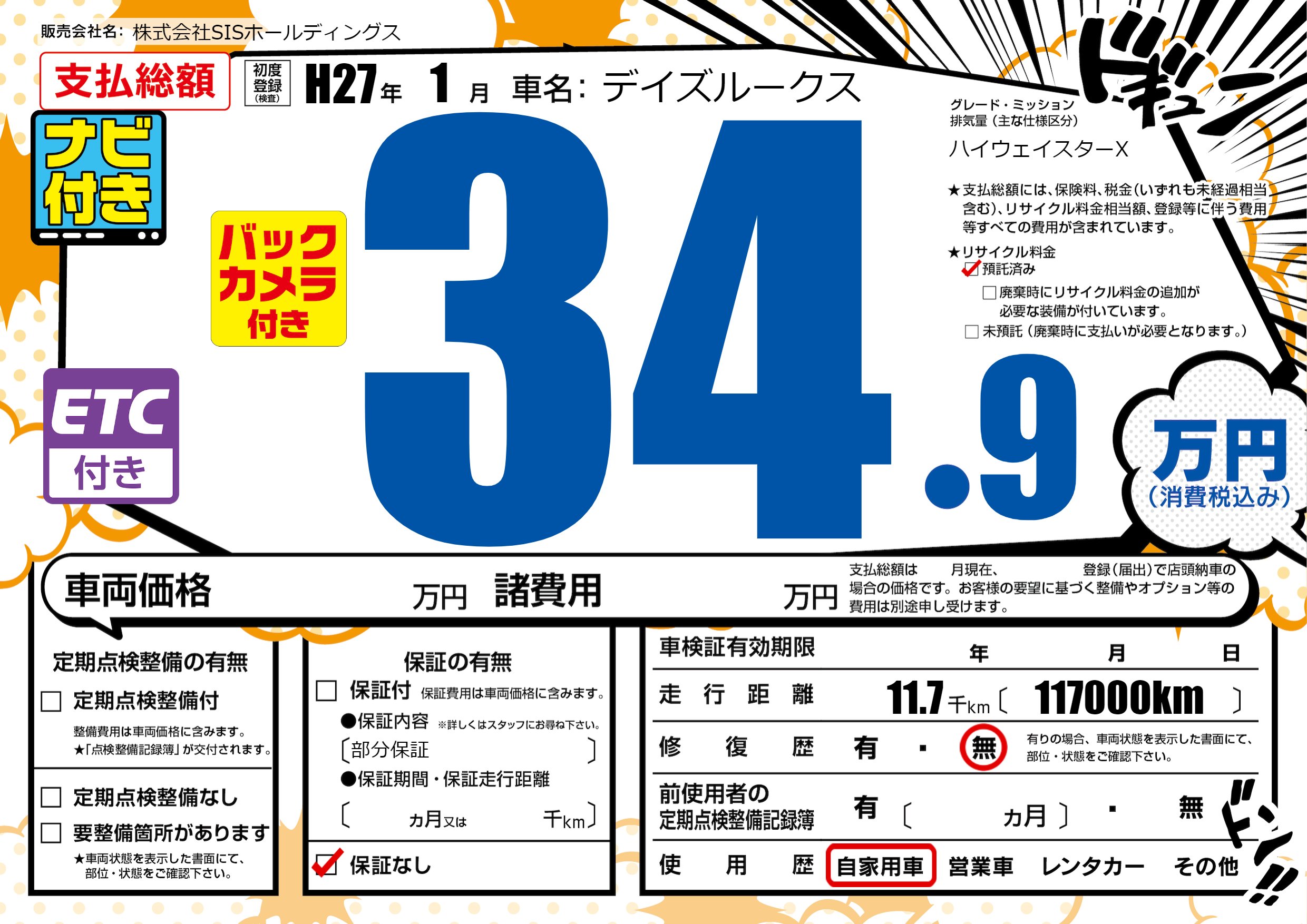 | 走行キロ | 1.1万km | 初年度登録 | H27年1月 |