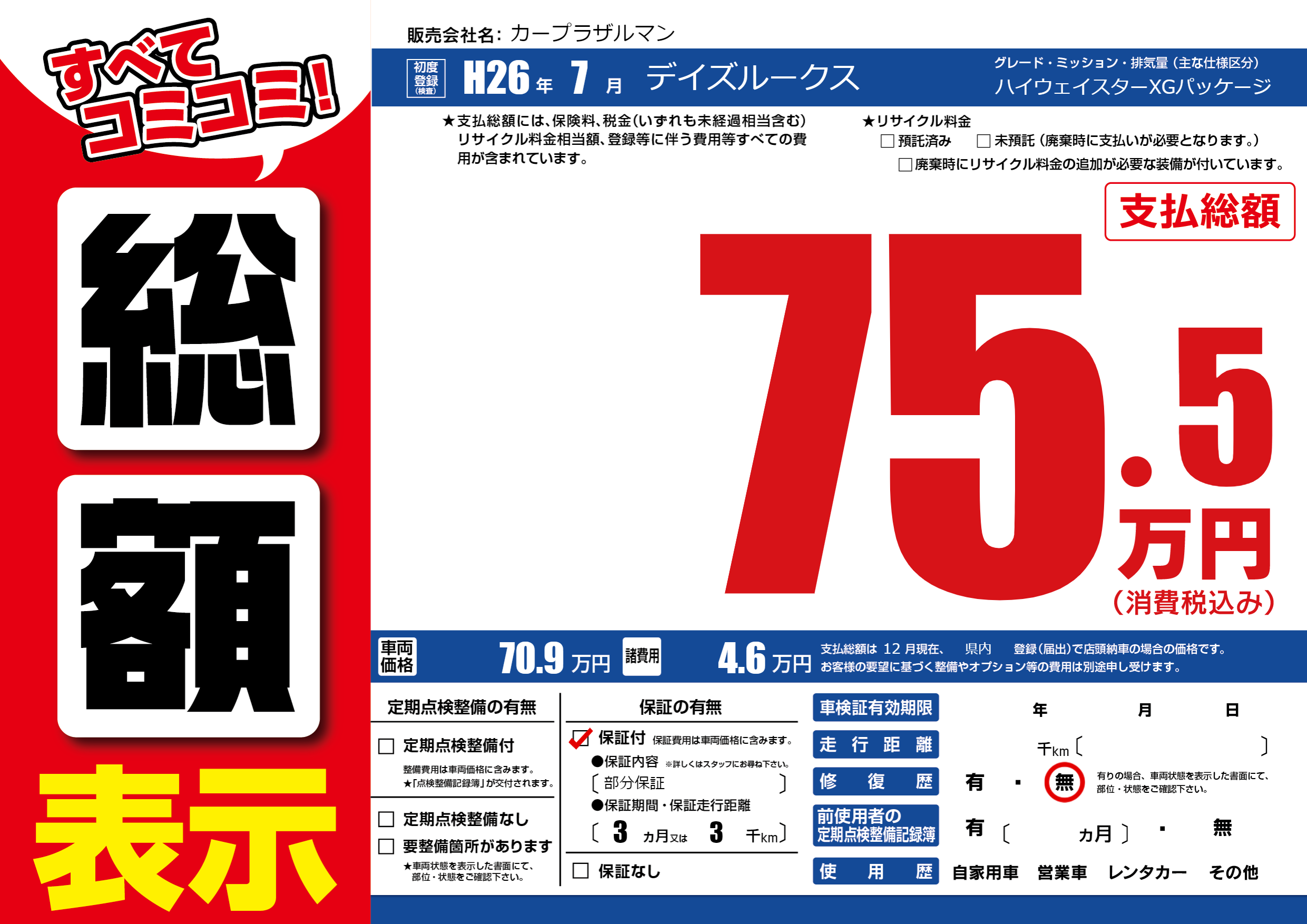 保証付き 保証内容(部分保証) 3ヶ月または(3)千kmまで |