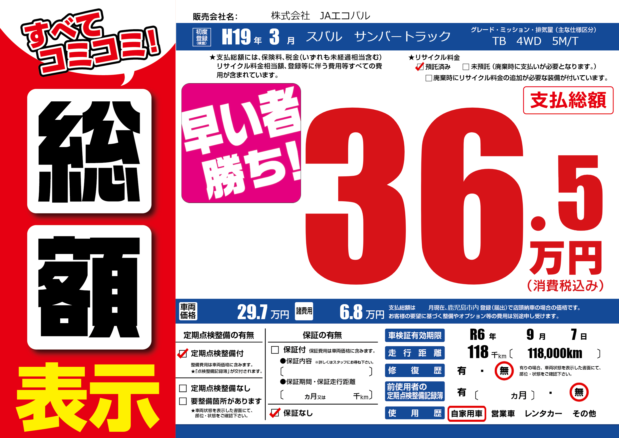 | 車名 | スバル サンバートラック | グレード ミッション 排気量 |