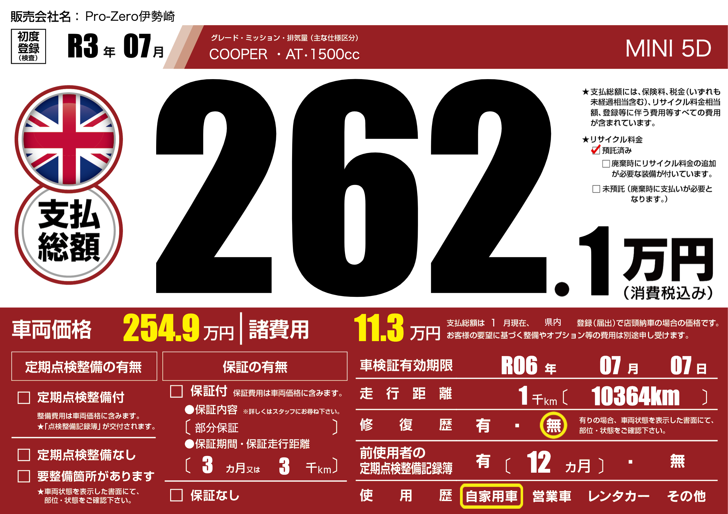 | 車名 | MINI 5D | グレード ミッション 排気量 |