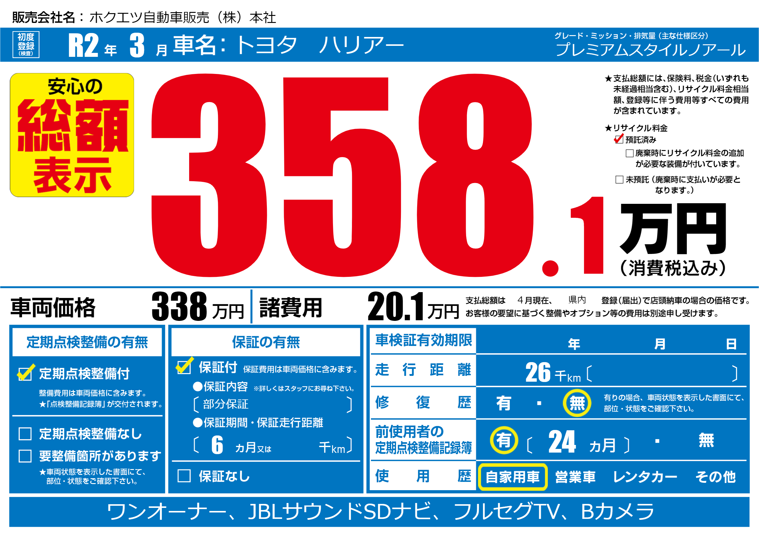 | 車名 | トヨタ ハリアー | グレード ミッション 排気量 |