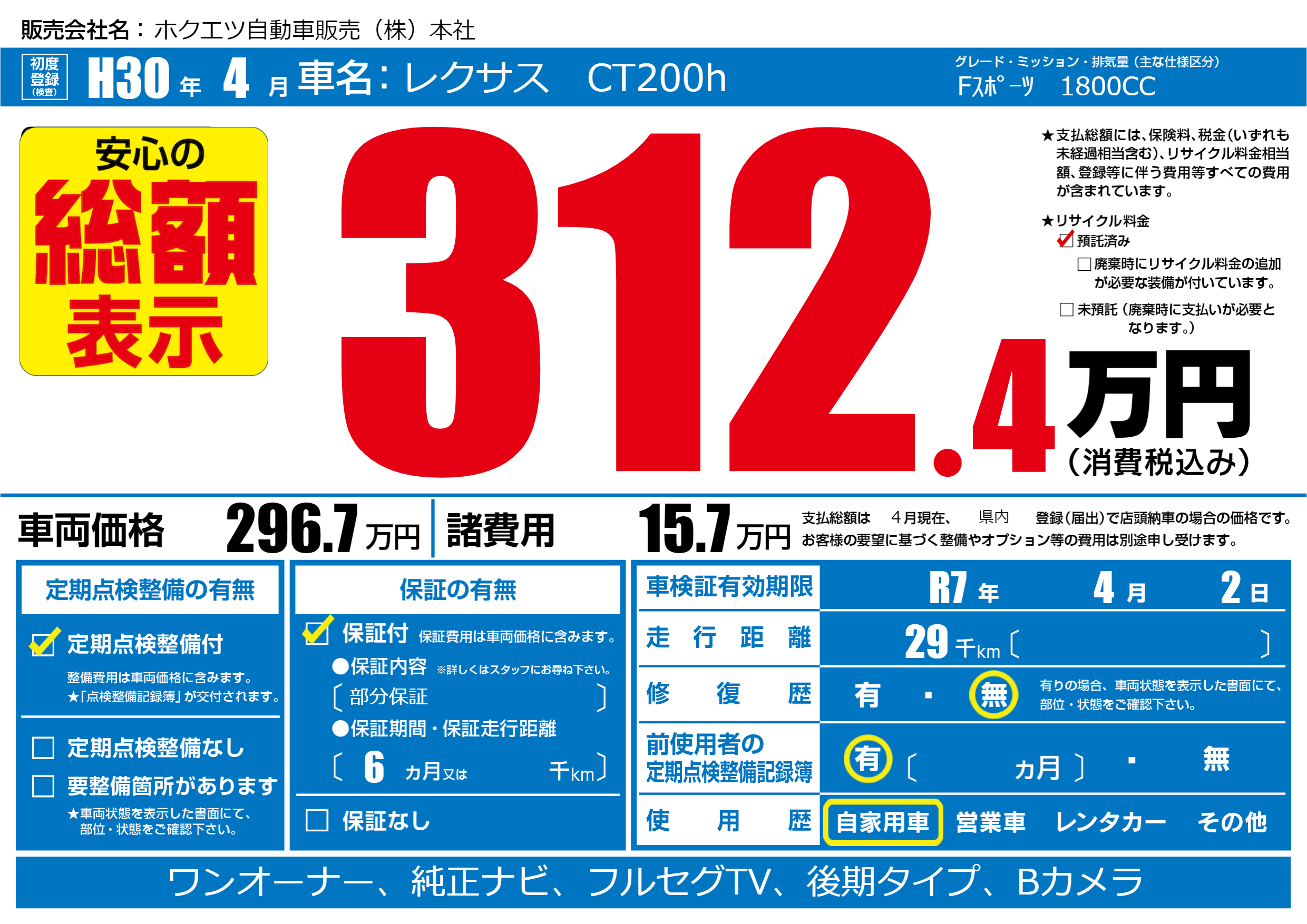 | 車名 | レクサス CT200h | グレード ミッション 排気量 |