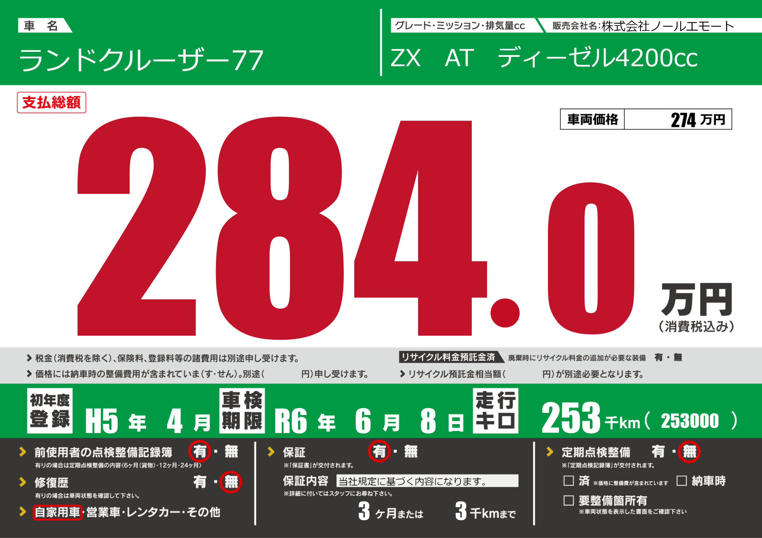 | 車名 | ランドクルーザー77 | グレード ミッション 排気量 |