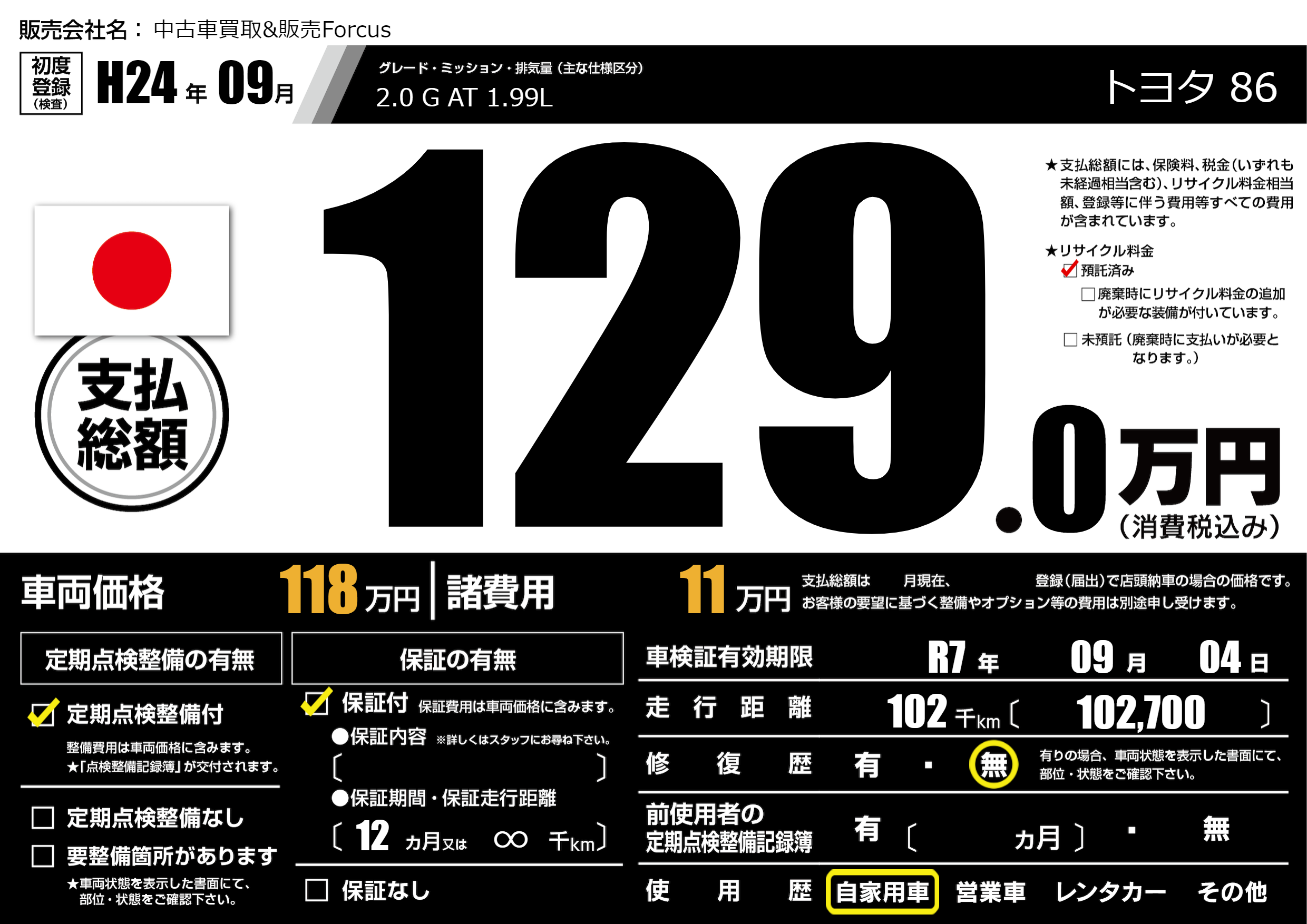 なし | 車検制限 | R7年09月04月 |