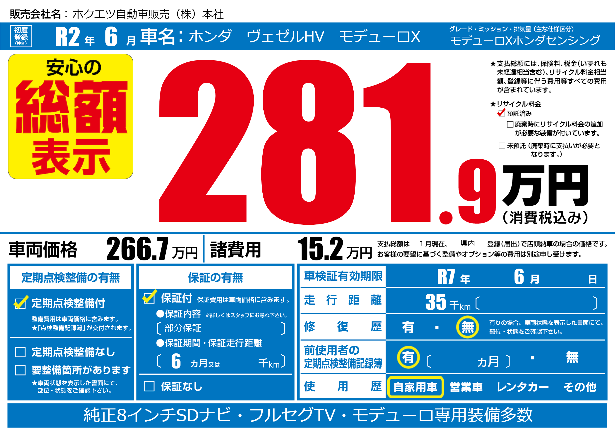 | 車名 | ホンダ ヴェゼルHV モデューロX | グレード ミッション 排気量 |