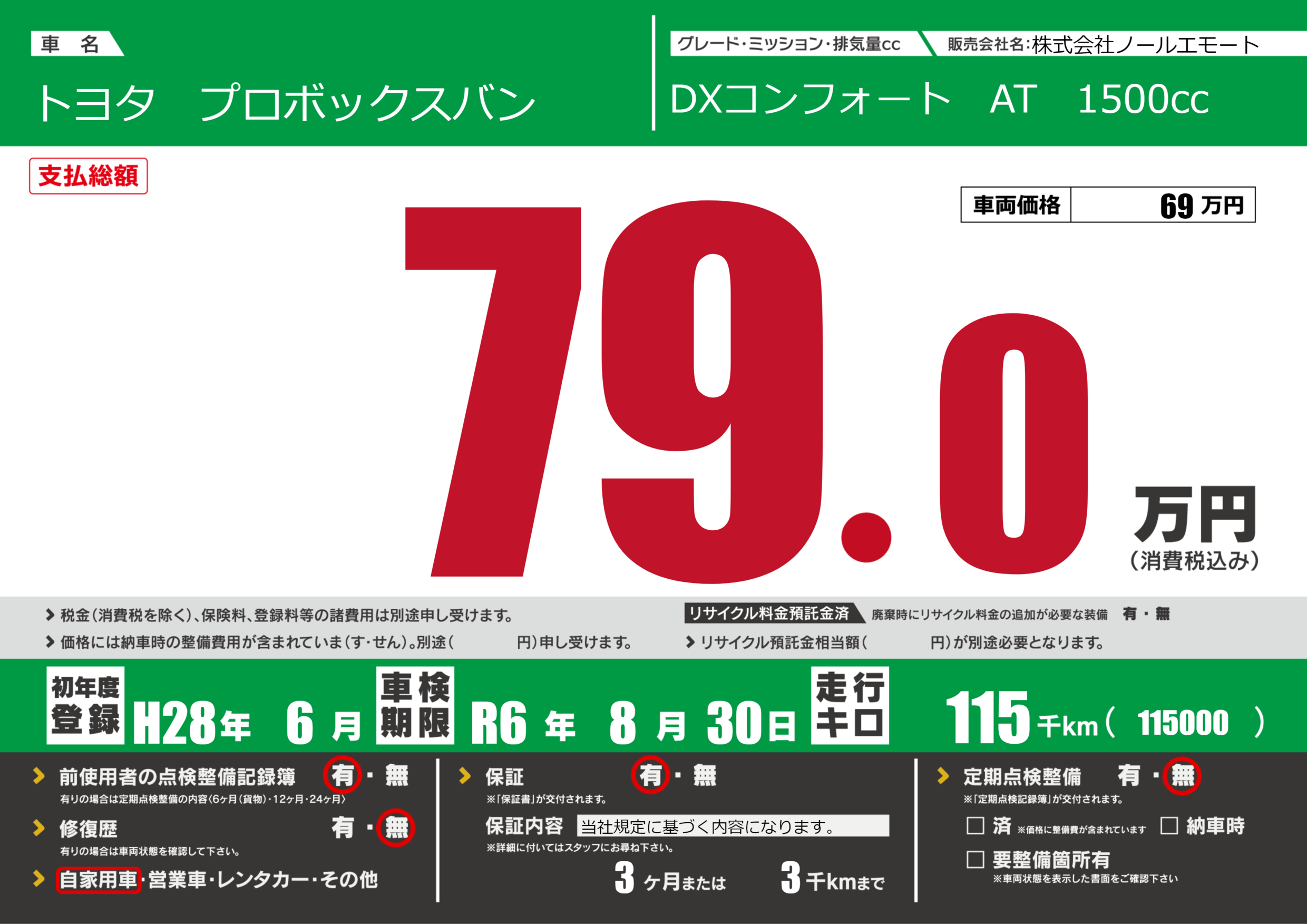 | 車名 | トヨタ プロボックスバン | グレード ミッション 排気量 |