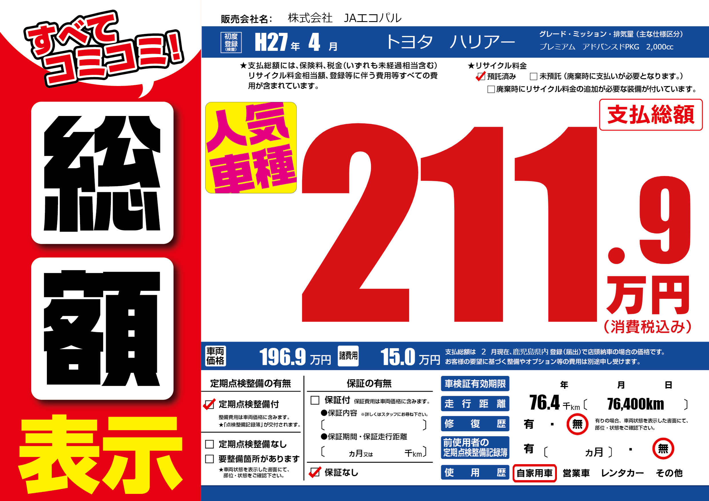 | 走行キロ | 7.6万km | 初年度登録 | H27年4月 |