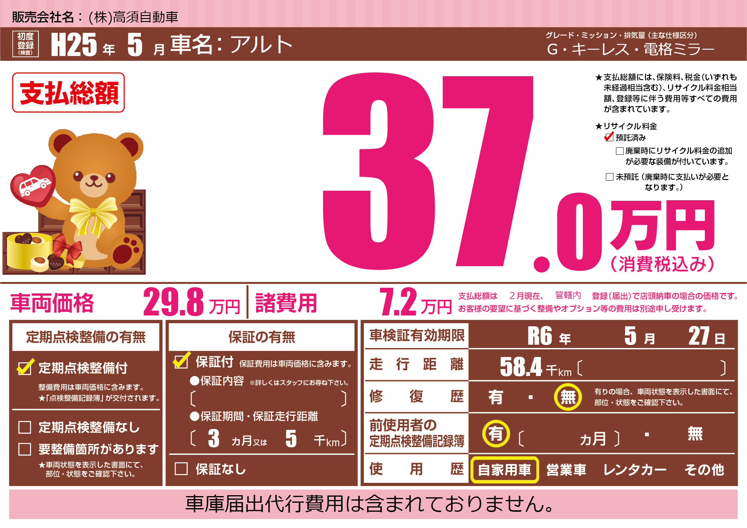 | 走行キロ | 5.8万km | 初年度登録 | H25年5月 |