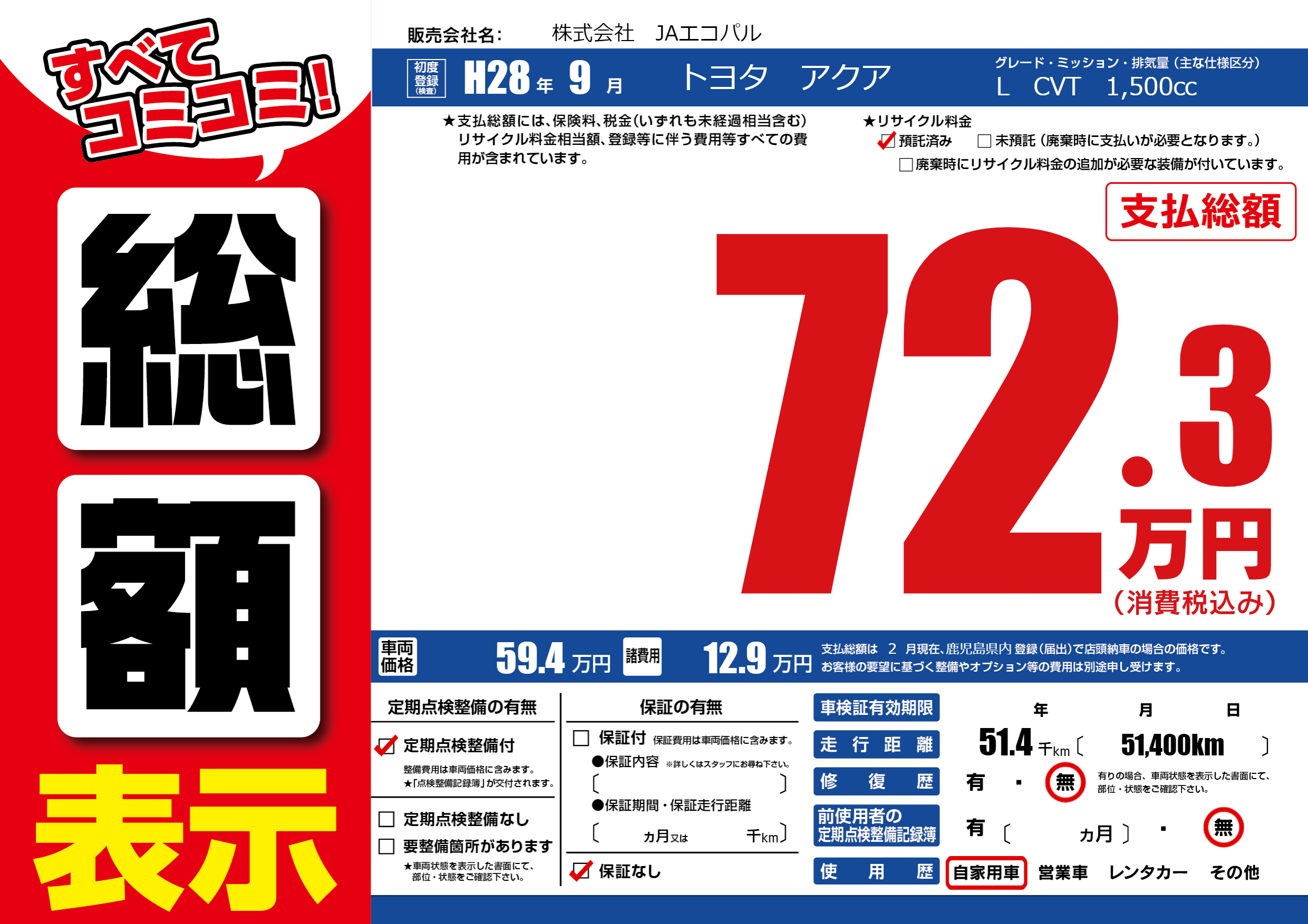 | 車名 | トヨタ アクア | グレード ミッション 排気量 |