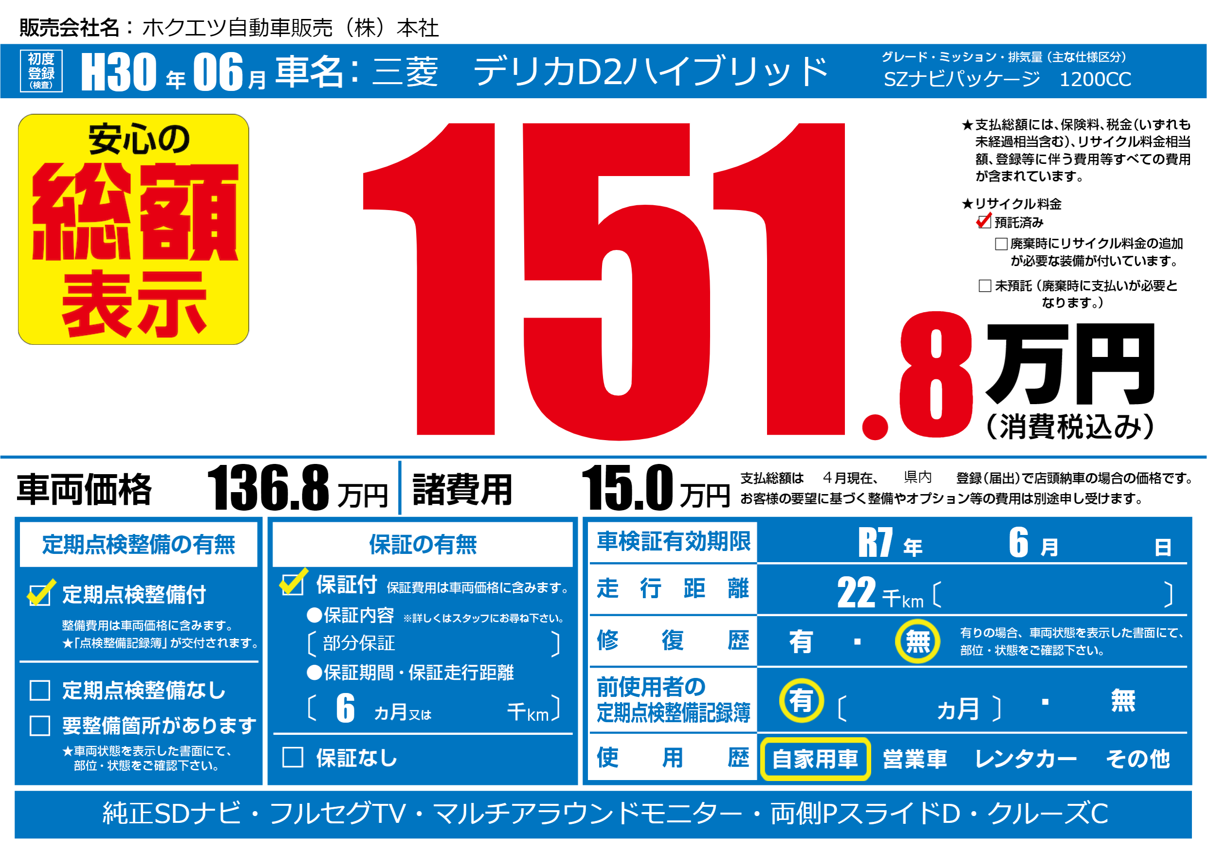 | 車名 | 三菱 デリカD2ハイブリッド | グレード ミッション 排気量 |