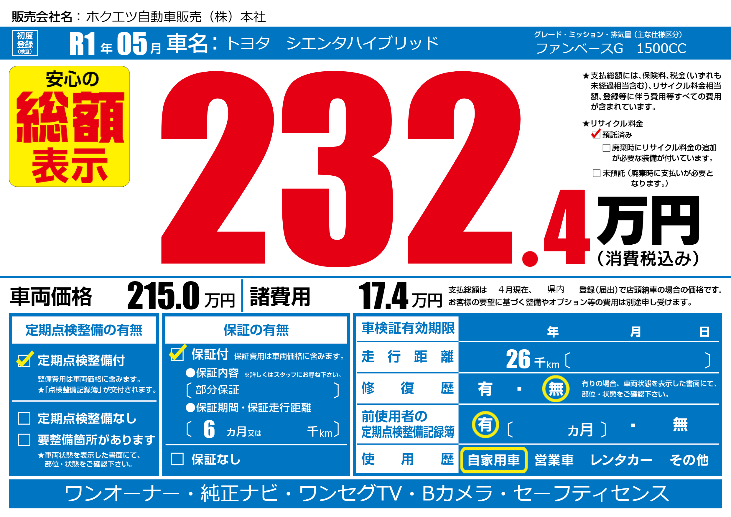 | 車名 | トヨタ シエンタハイブリッド | グレード ミッション 排気量 |