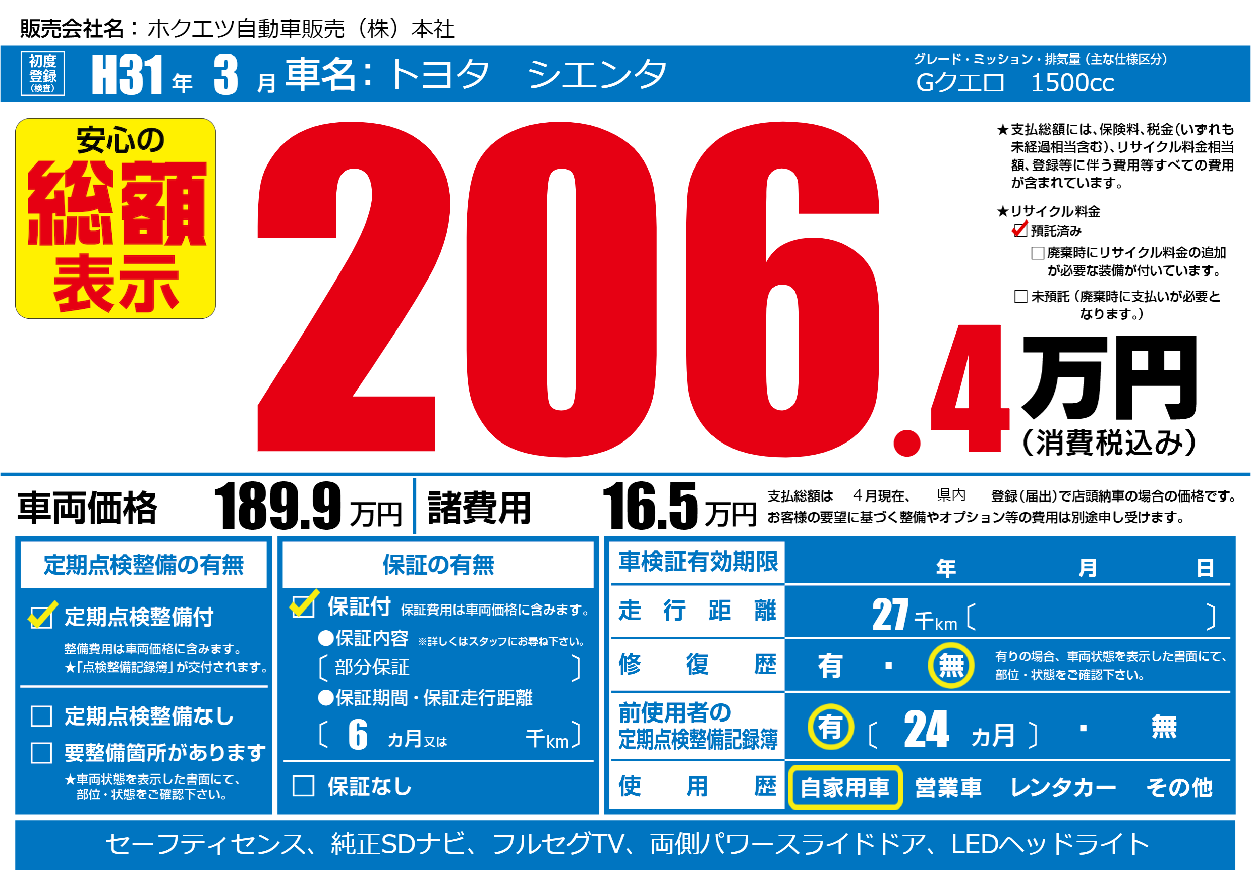 | 車名 | トヨタ シエンタ | グレード ミッション 排気量 |