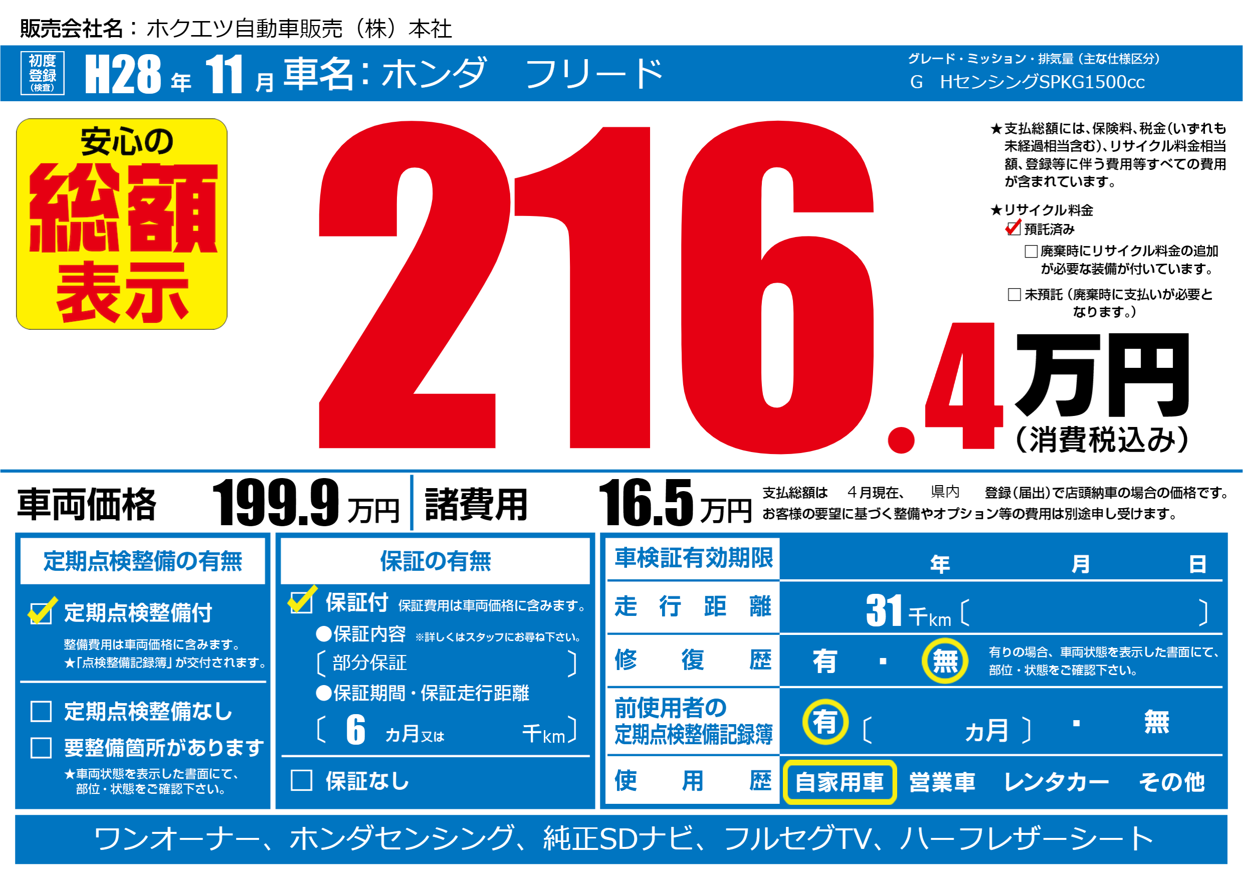 | 車名 | ホンダ フリード | グレード ミッション 排気量 |