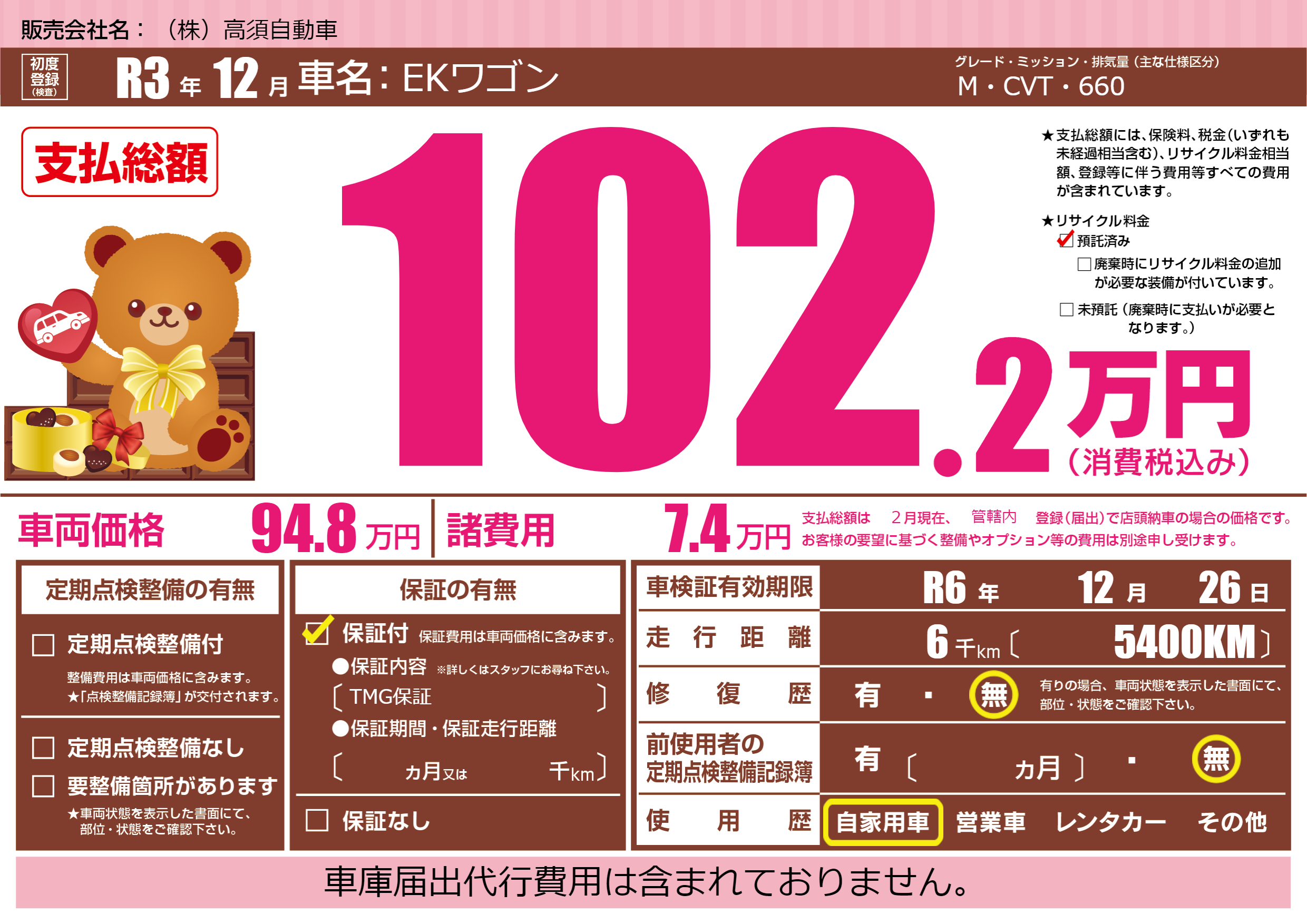 保証付き 保証内容(TMG保証) ---ヶ月または()千kmまで |