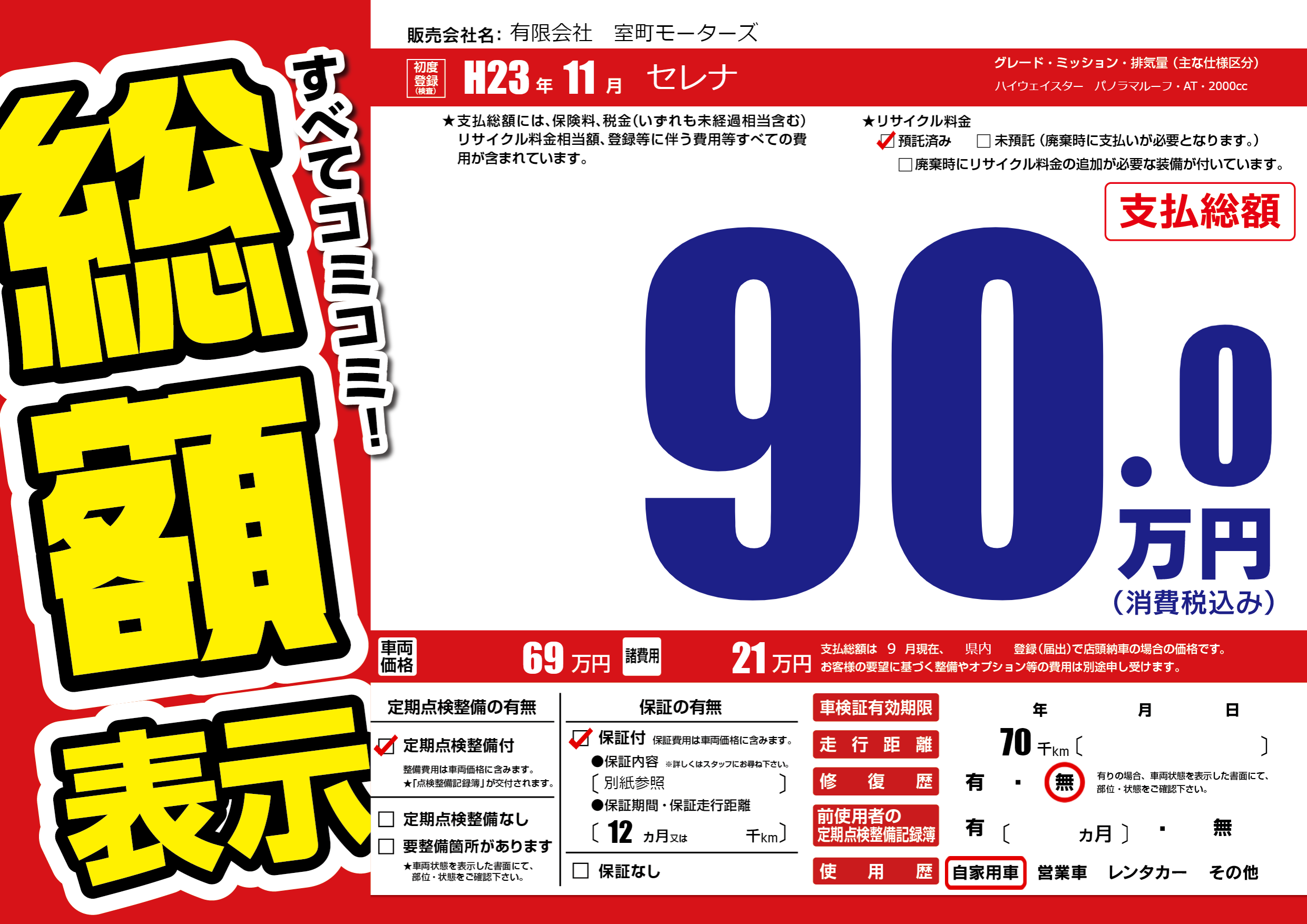 | 走行キロ | 7万km | 初年度登録 | H23年11月 |