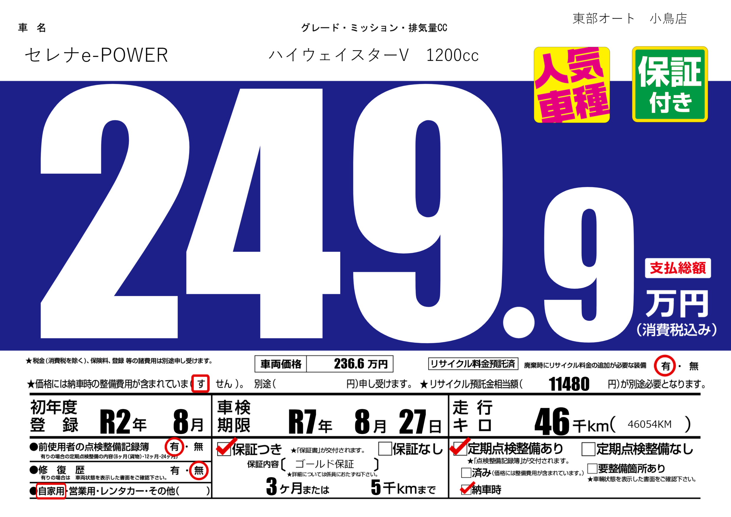 保証付き 保証内容( ゴールド保証) 3ヶ月または(5)千kmまで |