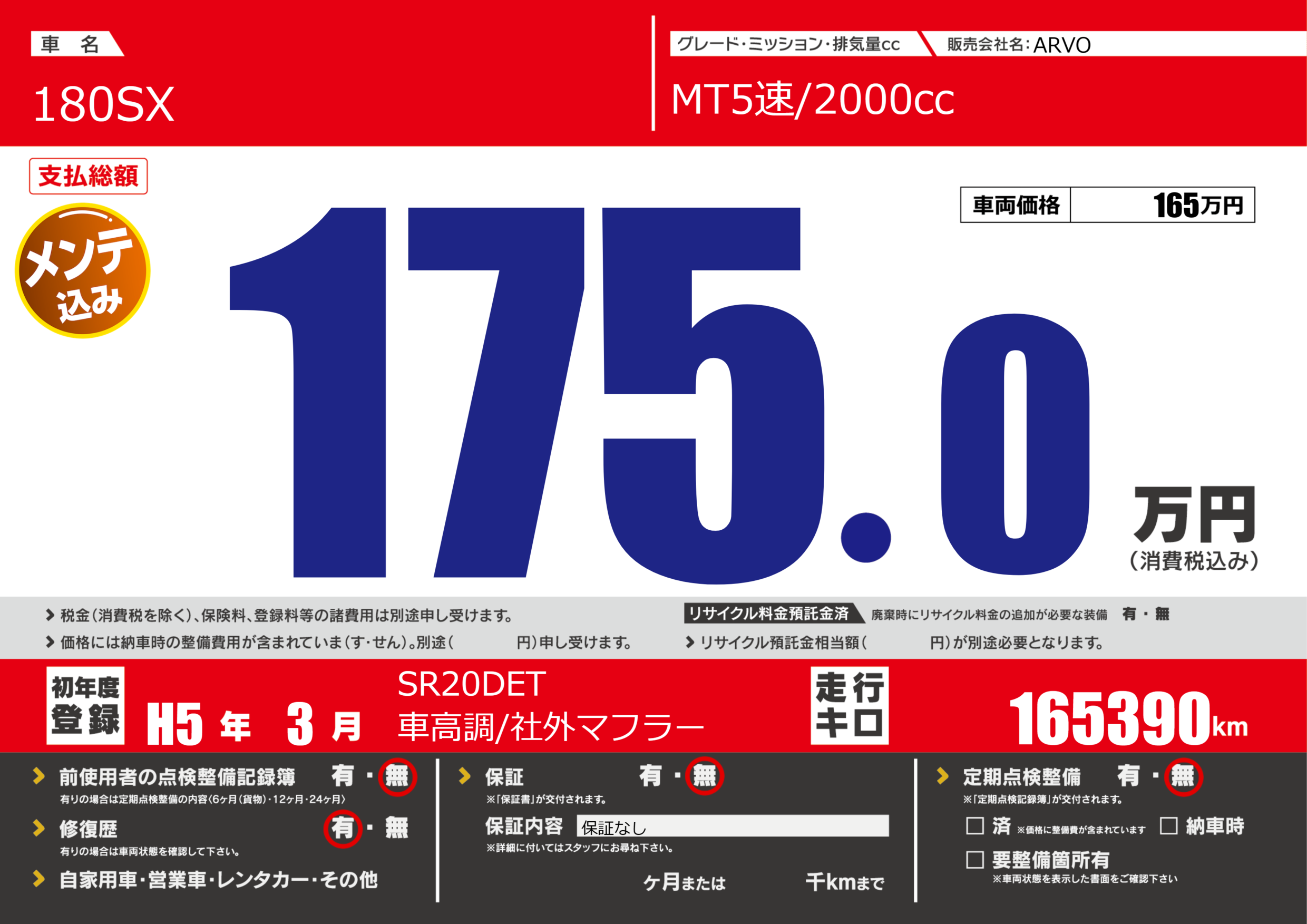 保証なし 保証内容(保証なし) ---ヶ月または()千kmまで |