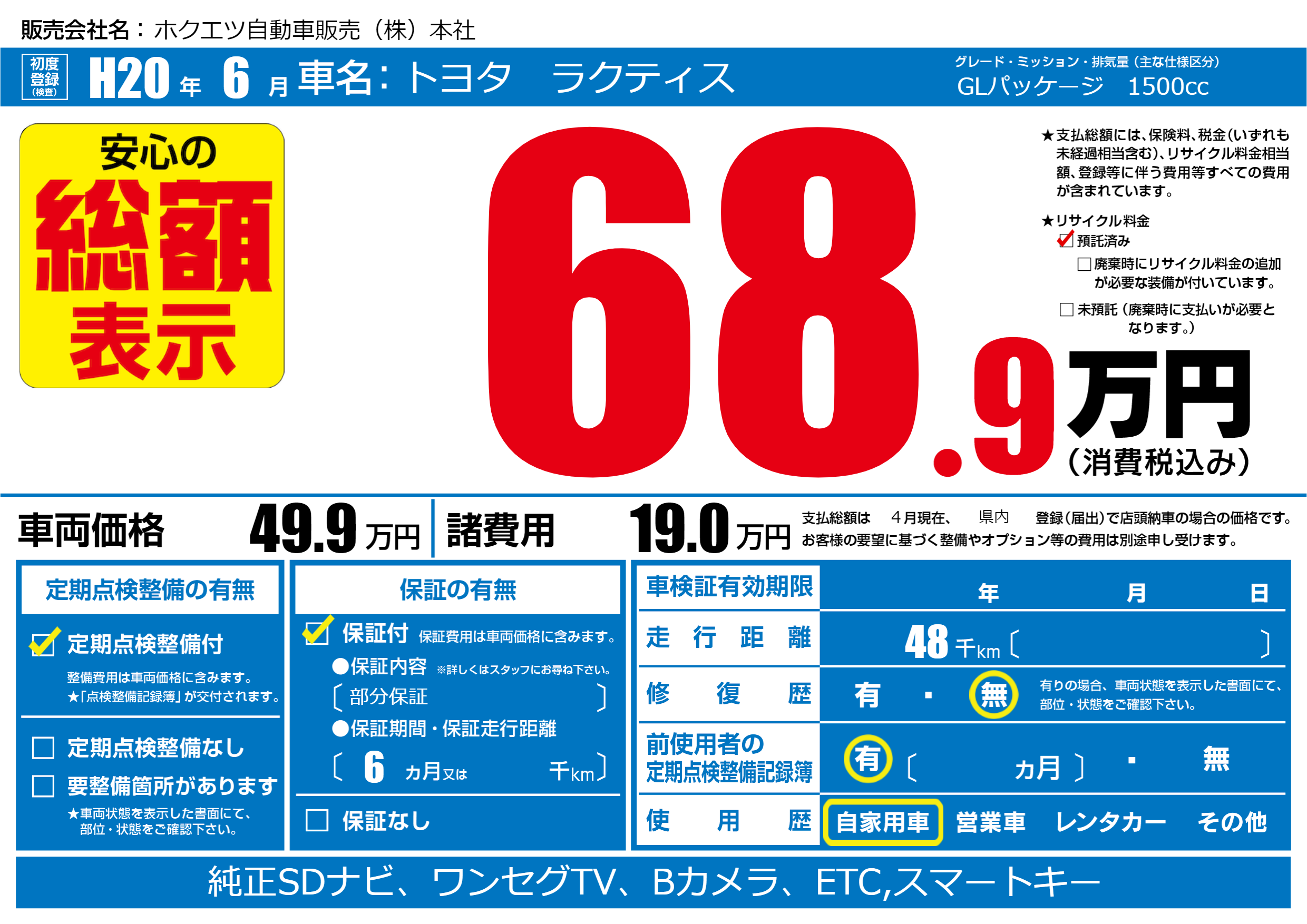 | 車名 | トヨタ ラクティス | グレード ミッション 排気量 |