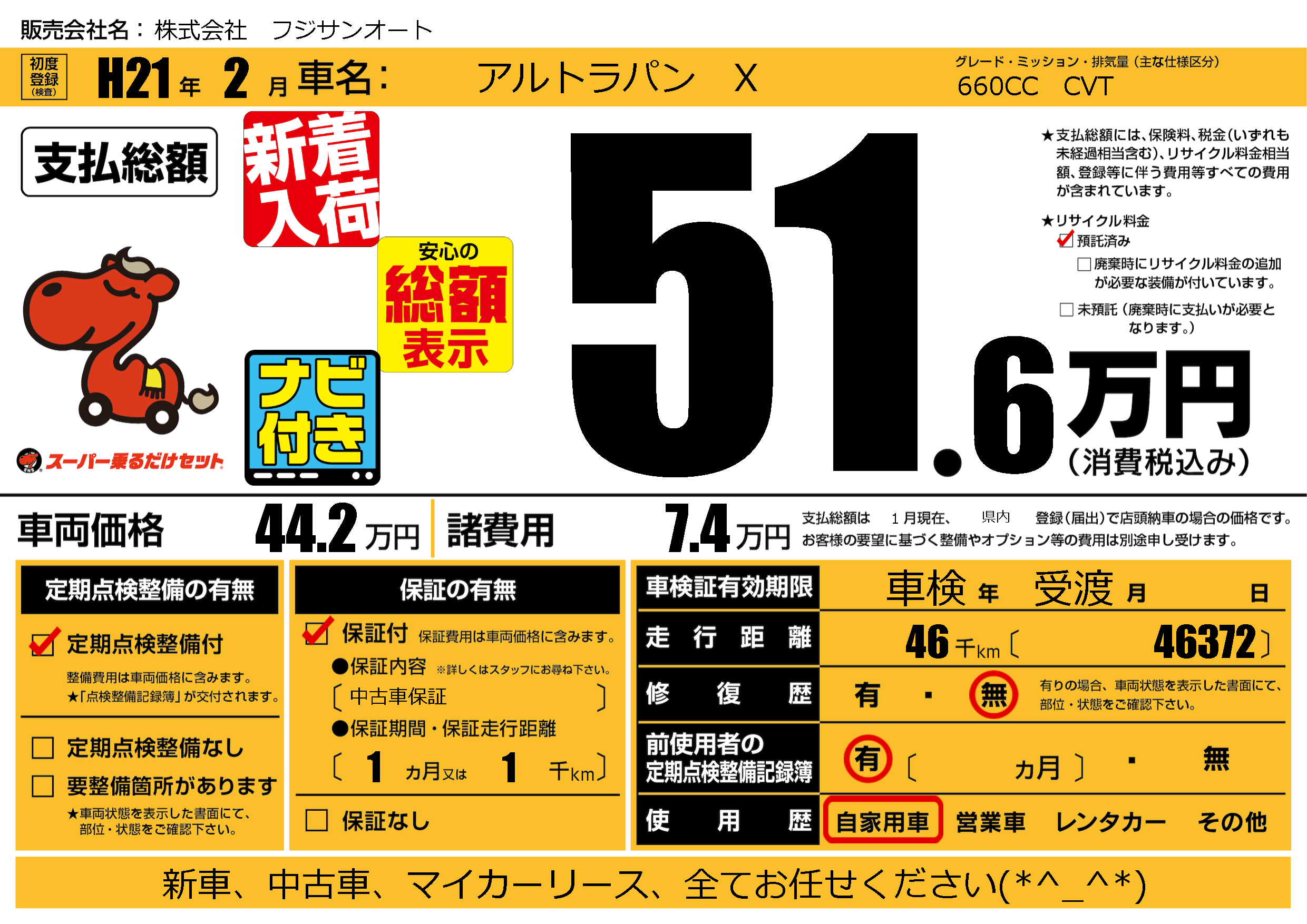 | 走行キロ | 4.6万km | 初年度登録 | H21年2月 |